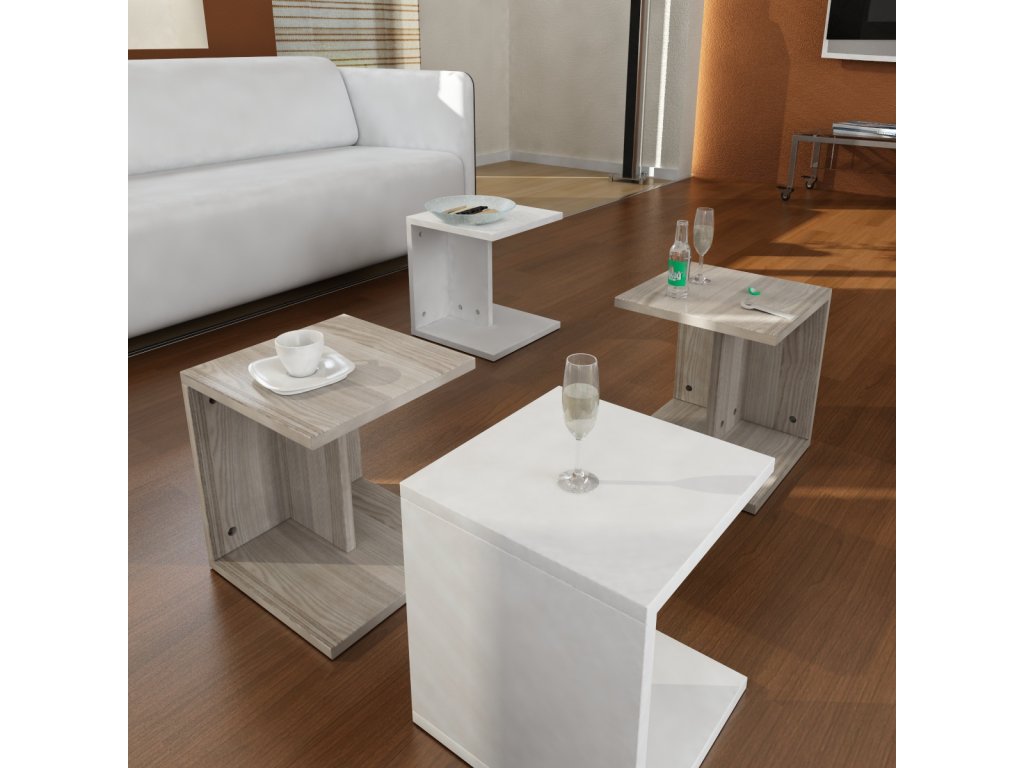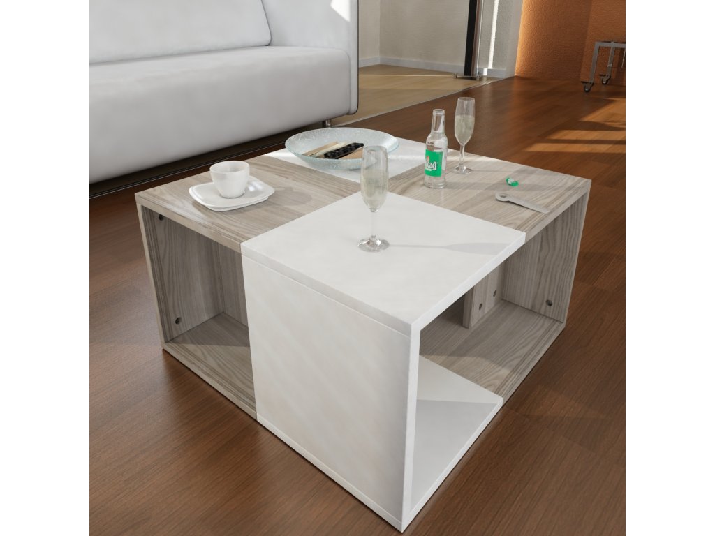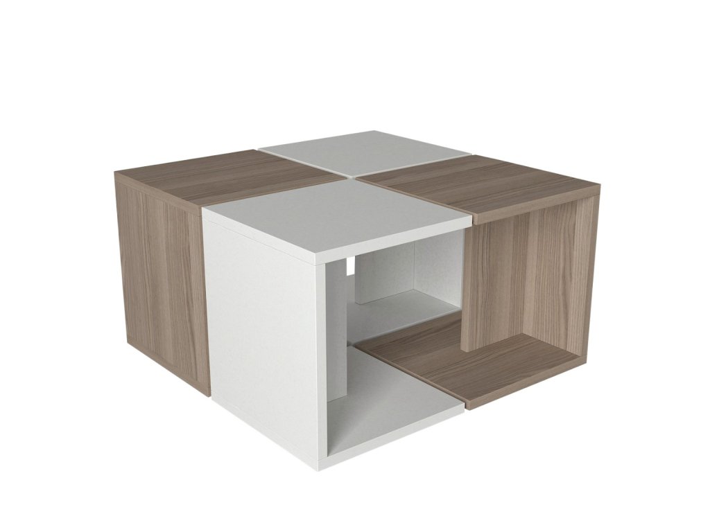Netradičný konferenčný stolík DUNDEE vás zaujme dizajnovým prevedením, ktoré pritiahne pozornosť každého návštevníka. Stolík má zaujímavú možnosť rozkladu, kde ho behom pár sekúnd premeníte na štyri malé príručné stolíky. Stáva sa tak multifunkčným kúskom, ktorého rozmanitú využiteľnosť oceníte pri rôznych príležitostiach. Vďaka otvoreným políciam poskytuje aj dostatok úložného priestoru na odloženie kníh, časopisov a ostatných drobností, ktoré chcete mať vždy po ruke. Kombinácia farieb biela + drevodekor je veľmi žiadaná a bude vhodná do väčšiny interiérov.