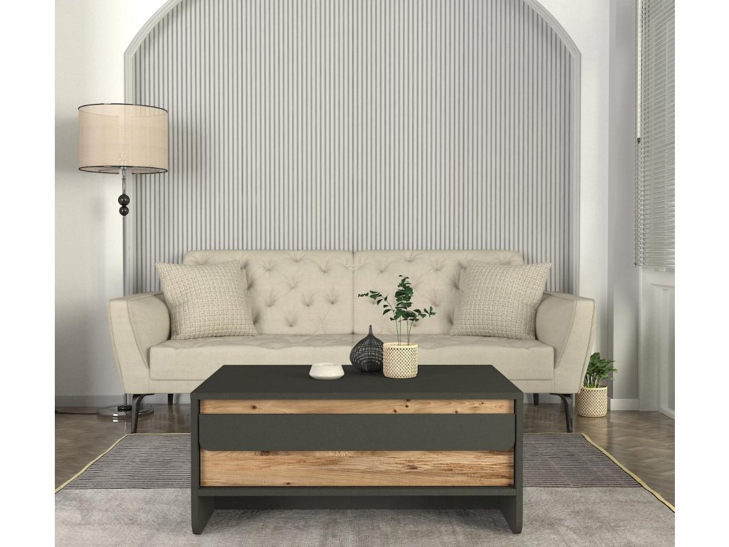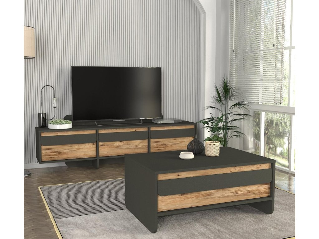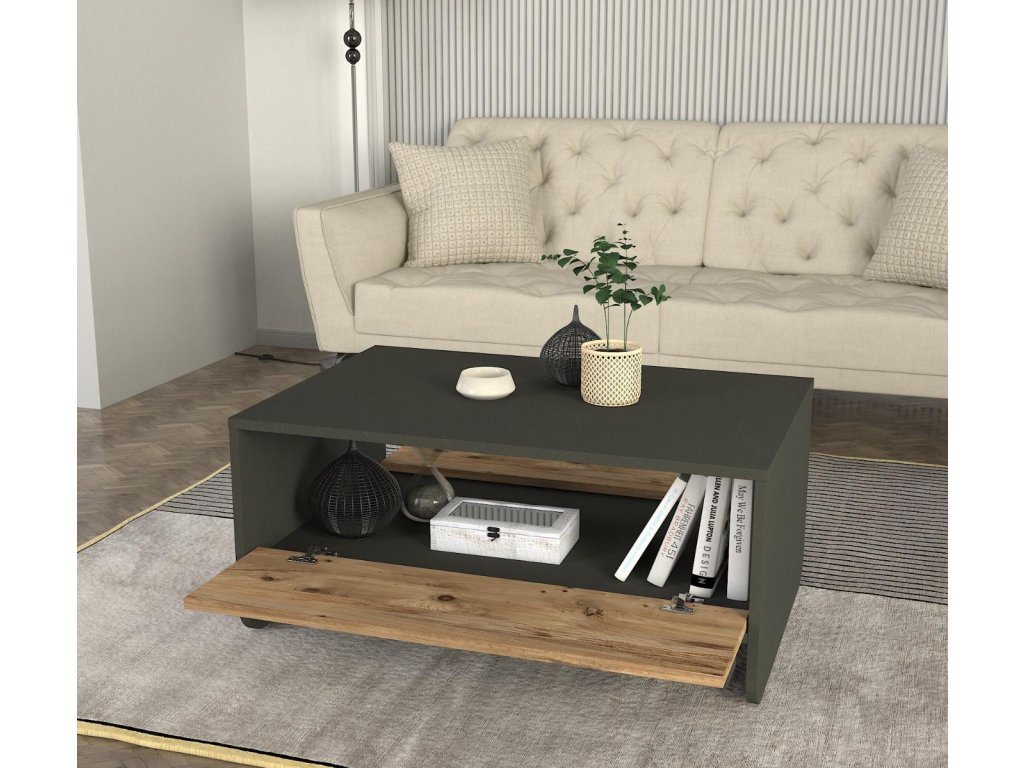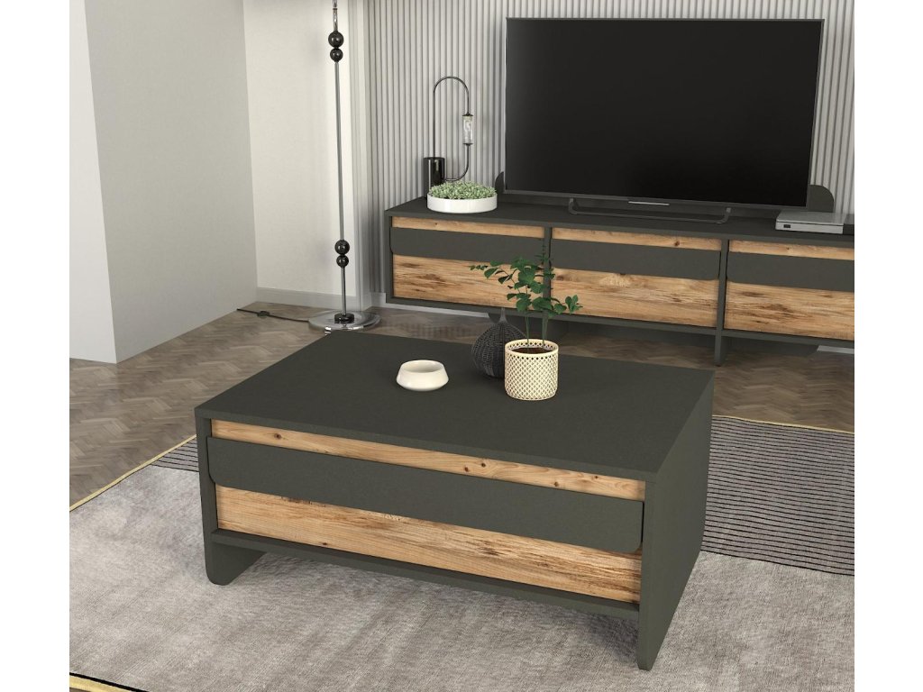Konferenčný stolík MEGY je vyrobený z kvalitného materiálu LTD s hrúbkou 18 mm, čo zaručuje jeho pevnosť a dlhú životnosť. Jeho elegantná kombinácia antracitovej a svetlo hnedej farby pridá vašej obývačke moderný nádych, zatiaľ čo obdĺžnikový tvar poskytuje dostatok priestoru pre všetky vaše potreby.