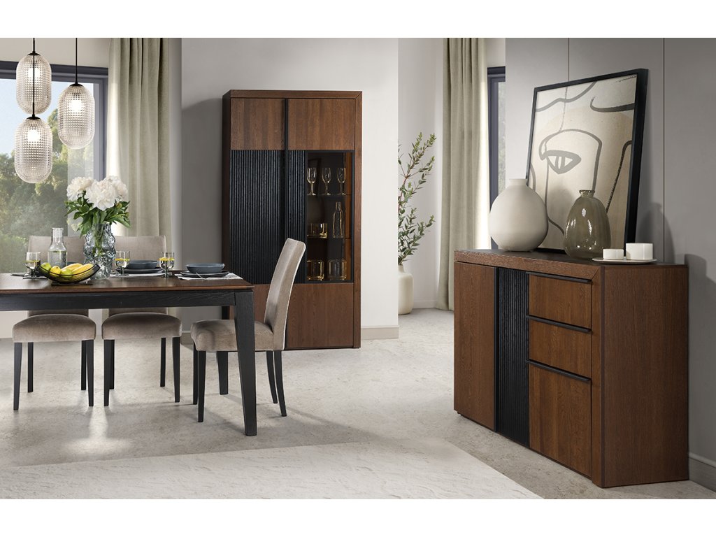 Predná časť nábytku je vyrobená z kvalitného dubového masívu s frézovanými časťami. Zadný korpus je z dyhovanej dosky. Nábytok je lakovaný v prírodnej farbe. Vďaka tomu zaručí čo najdlhšiu životnosť. Pánty majú tiché dovieranie. Úchytky sú v čiernej farbe. Sú vyrobené z kovu.