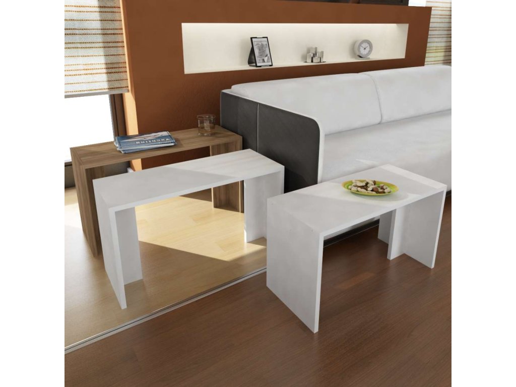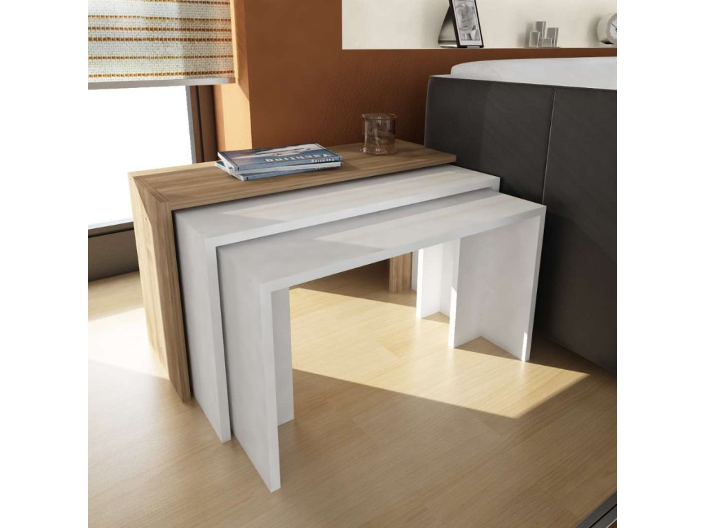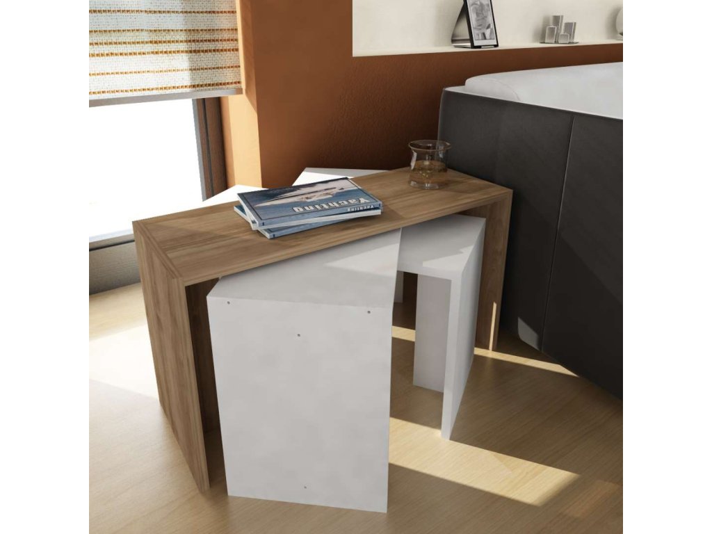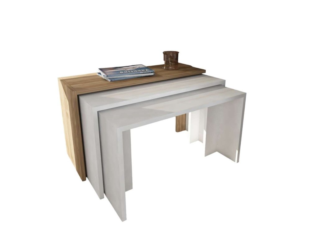 Stolík TANGO prináša do vašej obývačky moderný štýl a praktickosť. Kombinácia bielej a orechovej farby dodáva stolíku elegantný vzhľad, ktorý sa hodí do každého interiéru. Vďaka trom rôzne veľkým stolom, ktoré sú súčasťou zostavy, získate flexibilitu a dostatok priestoru na odkladanie vašich vecí.