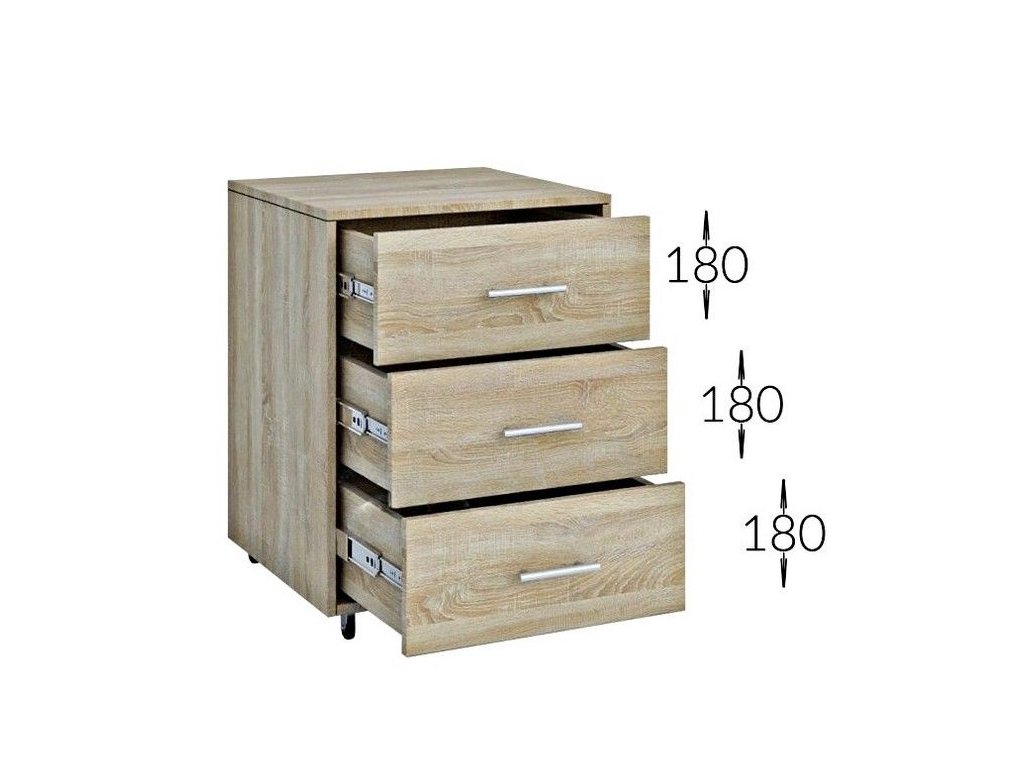 Kontajner MADAL Vám ponúkame vo veľmi priaznivej cene. Je ideálny ku písaciemu stolu MADAL. Ponúka doplnkový odkladací priestor vo forme 3 výsuvných šuplíkov aj hornú dosku, kde si viete umiestniť napr. tlačiareň. Je položený na kolieskach, čo dáva možnosť jeho presunu podľa potrieb. Tento nábytok je vyrobený z kvalitnej LTD dosky, ktorá nie je náročná na údržbu. Farebné prevedenie je v stále žiadanom odtieni dub sonoma. Úchyty sú v striebornej farbe. Rozmery (v/š/h): 58 x 50 x 40 cm. MADAL je prakticky riešený nábytok, ideálny pre zariadenia pracovne či kancelárie. Ponúka niekoľko prvkov, ktorých kombináciou si vytvoríte ideálnu zostavu podľa Vašich potrieb a požiadaviek. Dodávame v demonte. Farba na obrázku môže mať iný odtieň ako reálny materiál.