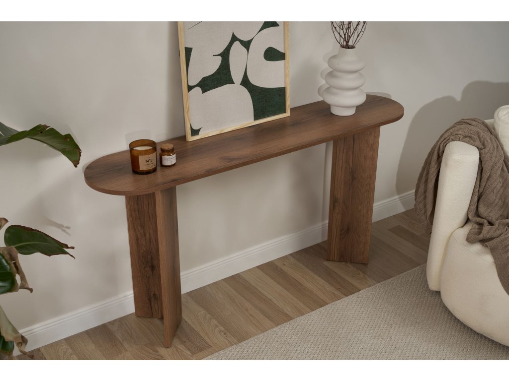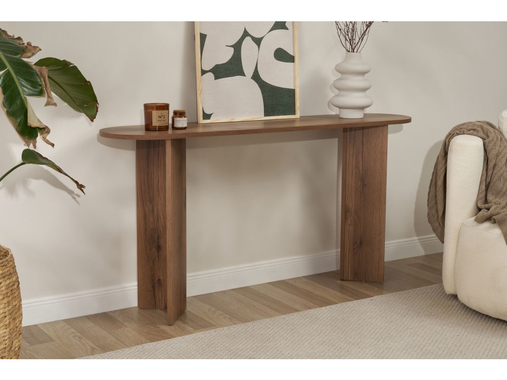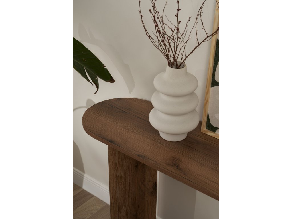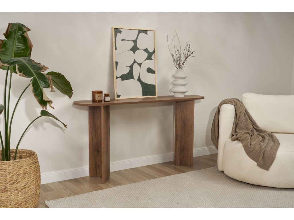 Elegantný dizajn tejto konzoly okamžite pozdvihne vzhľad každej miestnosti vo vašom dome. Sýta orechová farba dodáva vášmu priestoru teplo a hĺbku, zatiaľ čo čisté línie a moderná silueta mu dodávajú moderný nádych.