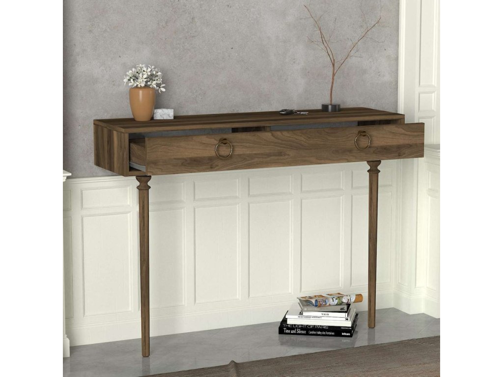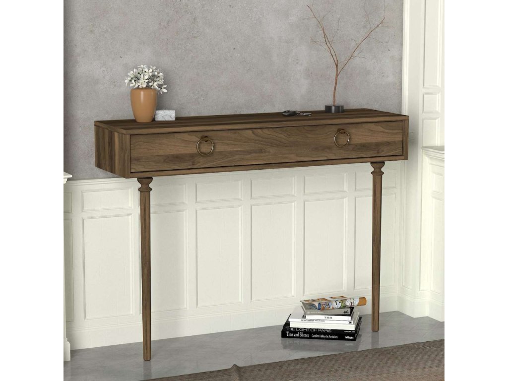 Konzolový stolík GODLY vyniká svojou obdĺžnikovou konštrukciou a elegantnou orechovou farbou, ktorá prináša do vášho interiéru sofistikovaný vzhľad. Praktická zásuvka poskytuje dostatok úložného priestoru pre vaše osobné veci, čím zaisťuje, že váš priestor zostane vždy uprataný a organizovaný.