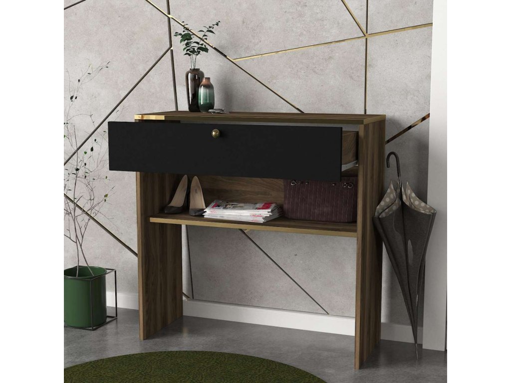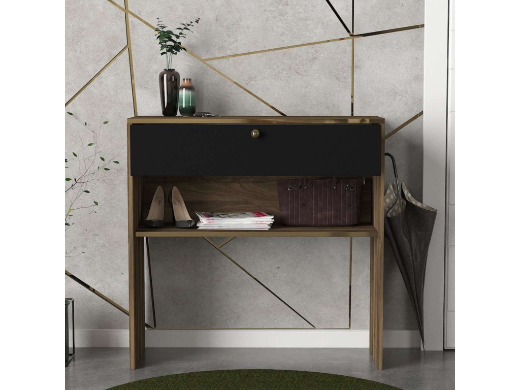 Konzolový stolík LOUISE ponúka praktickú odkladaciu policu, ktorá je ideálna na uloženie vašich dekorácií, kníh alebo ďalších drobností. Jeho obdĺžnikový tvar a kombinácia orechovej a čiernej farby pridáva do každého interiéru sofistikovaný a moderný vzhľad.