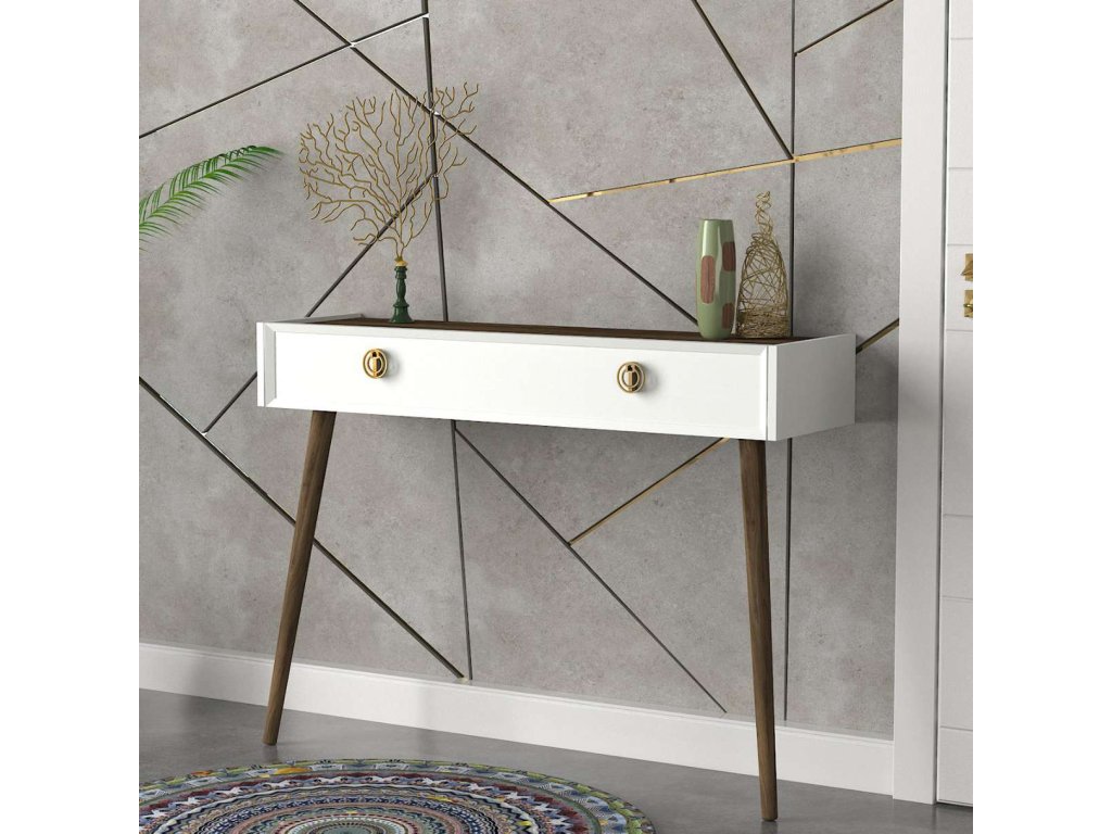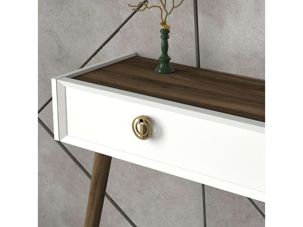Konzolový stolík NADA sa vyznačuje svojou elegantnou kombináciou bielej farby a orechového dekoru, čo pridáva vášmu interiéru moderný a čistý vzhľad. Praktická zásuvka poskytuje dostatok priestoru na uloženie vašich drobností, zatiaľ čo obdĺžnikový tvar stola ponúka dostatok miesta na vystavenie dekorácií, kníh alebo ďalších predmetov.