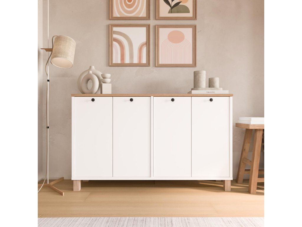 Stolík je vyrobený z kvalitného melamínu a VT laminátu, čo zabezpečuje pevnosť a jednoduchú údržbu. Disponuje 4 plnými dvierkami, ktoré poskytujú dostatok úložného priestoru na doplnky, riad či osobné veci. Elegantné úchytky z matného čierneho kovu dodávajú nábytku moderný kontrast.