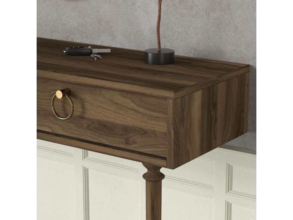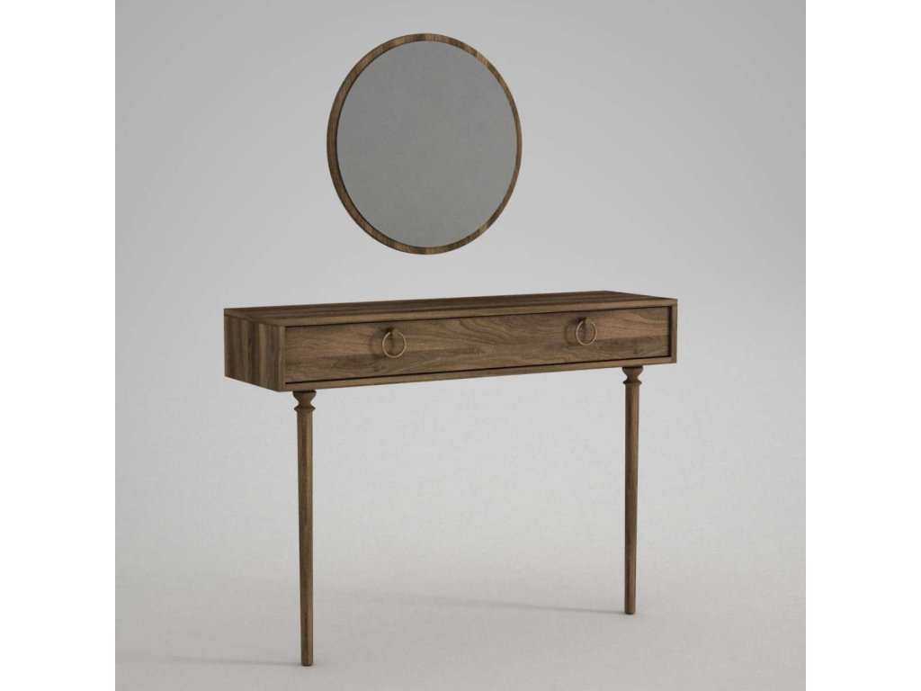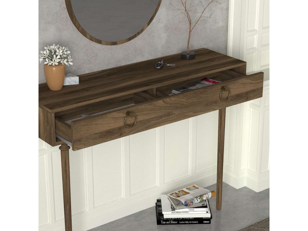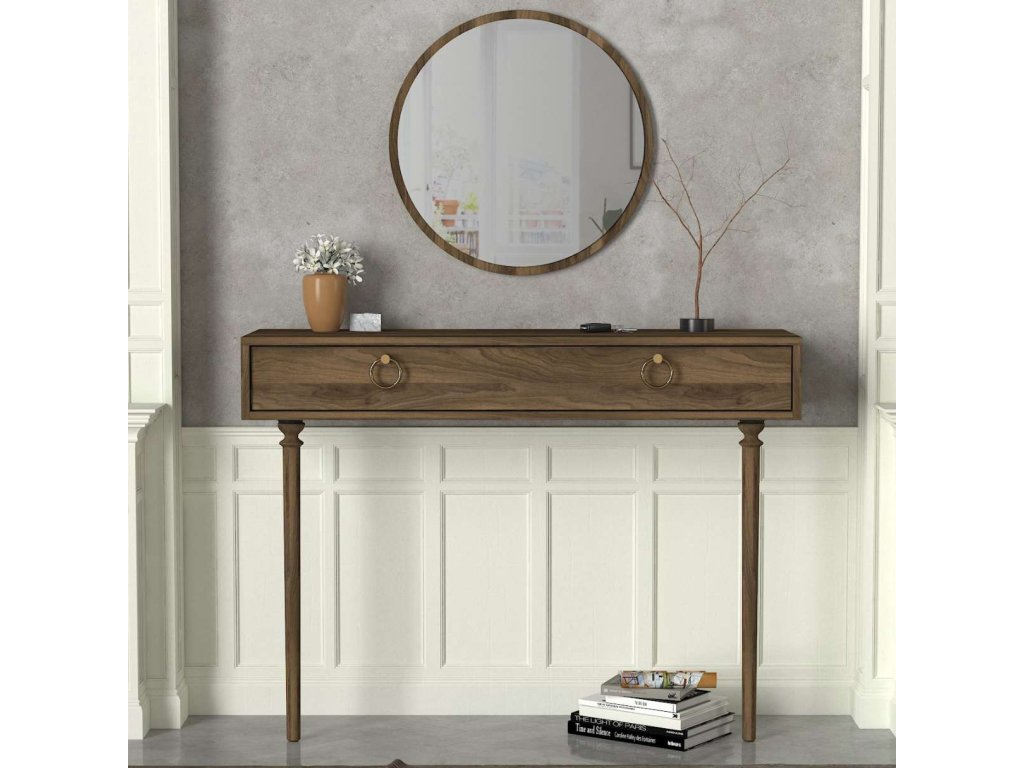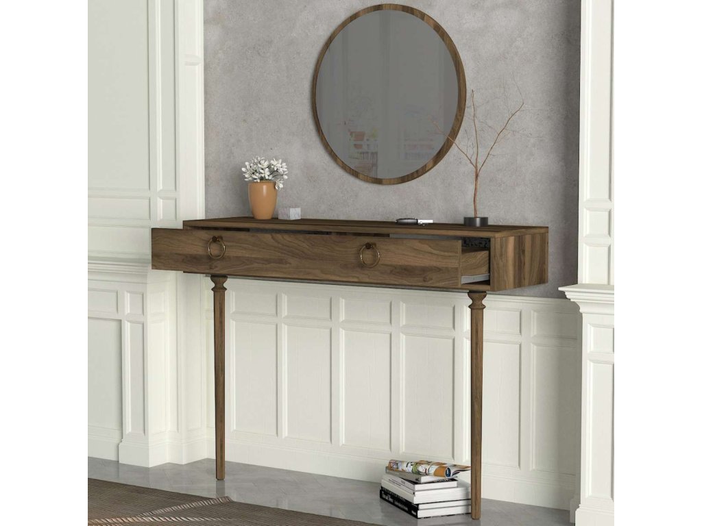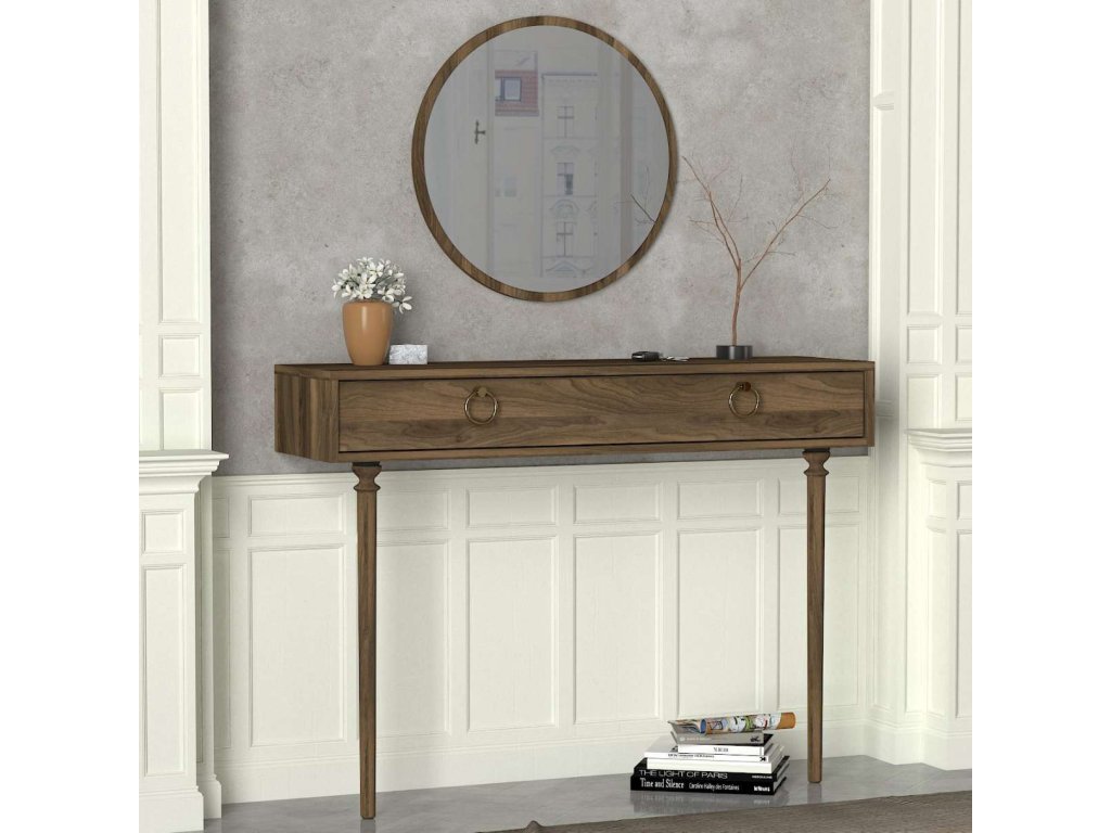 Konzolový stolík GODLY M sa vyznačuje elegantným dizajnom v orechovej farbe, ktorý sa hodí do akéhokoľvek moderného interiéru. Praktická zásuvka ponúka dostatok úložného priestoru pre vaše drobnosti, zatiaľ čo nástenné zrkadlo dodáva miestnosti hĺbku a svetlo.