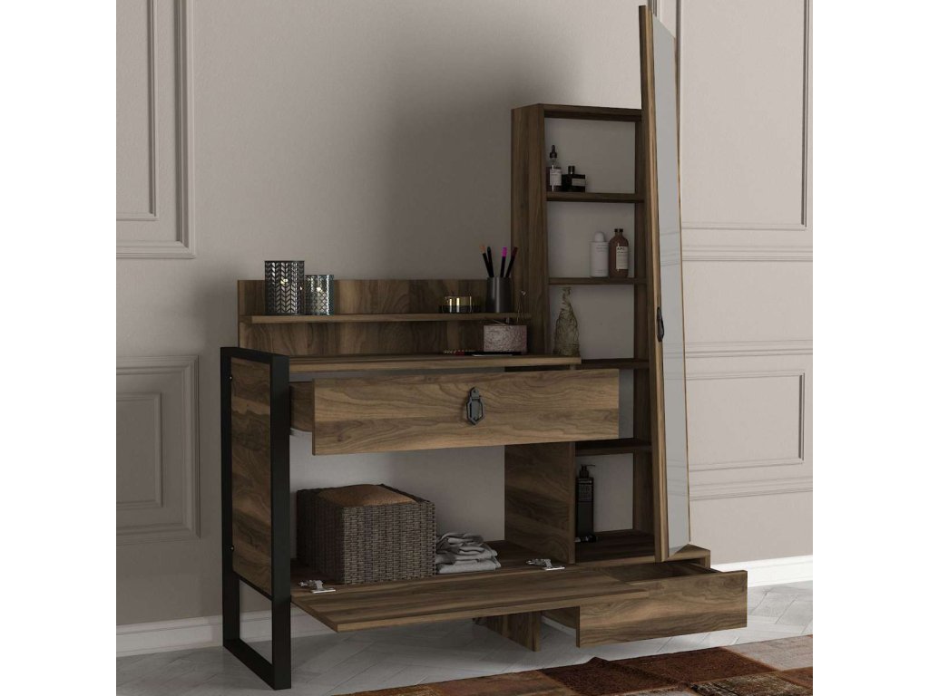 Toaletný stolík LUST je vyrobený z kvalitného LTD materiálu s hrúbkou 18 mm, doplneného kovovými a sklenenými prvkami, čo zaisťuje jeho dlhú životnosť a odolnosť. Elegantná orechová farba prinesie do vašej spálne moderný a sofistikovaný vzhľad.