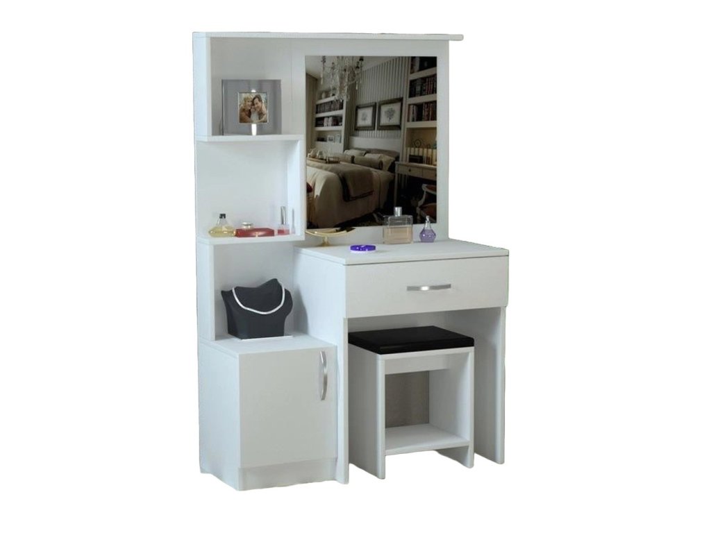 | Vlastnosti a vybavenie: | 1 zásuvka, stolička, taburet, zrkadlo |