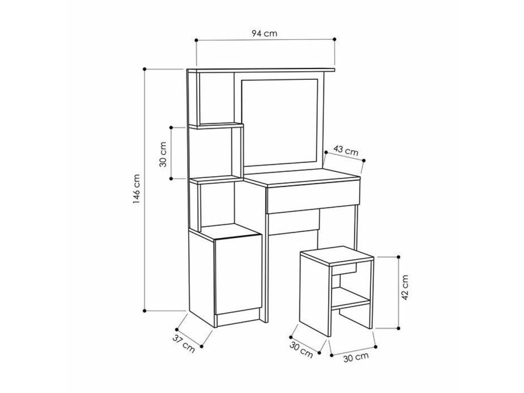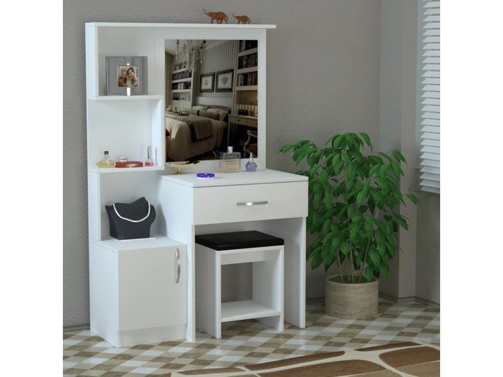 Toaletný stolík VELLA je vybavený 1 skrinkou, 1 zásuvkou, zrkadlom a pohodlným taburetom v cene. Tento stolík poskytuje dostatok priestoru na uloženie vašich kozmetických potrieb a doplnkov. Vyrobený z kvalitnej drevotriesky potiahnutej melamínom, zaručuje dlhú životnosť a odolnosť.