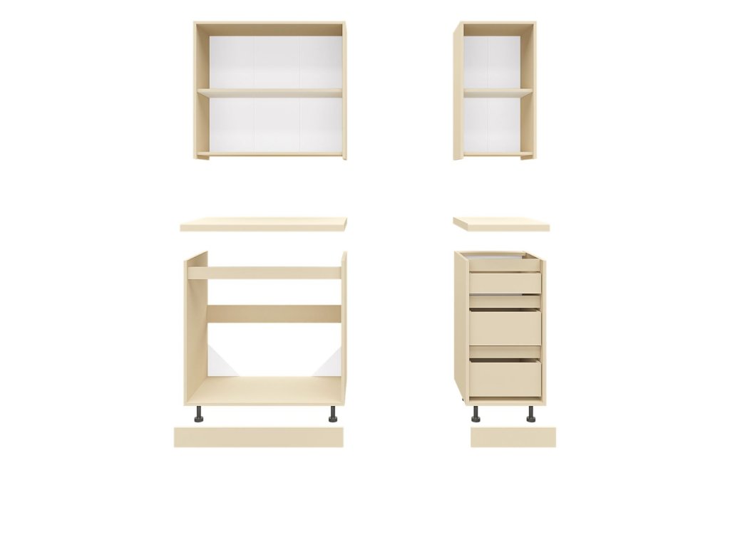 | Zostava obsahuje: | 1 ks horná dvojdverová skrinka 80 cm 1 horná jednodverová skrinka 40 cm 1 ks dolná dvojdverová drezová skrinka 80 cm 1 ks dolná skrinka so zásuvkami 40 cm |