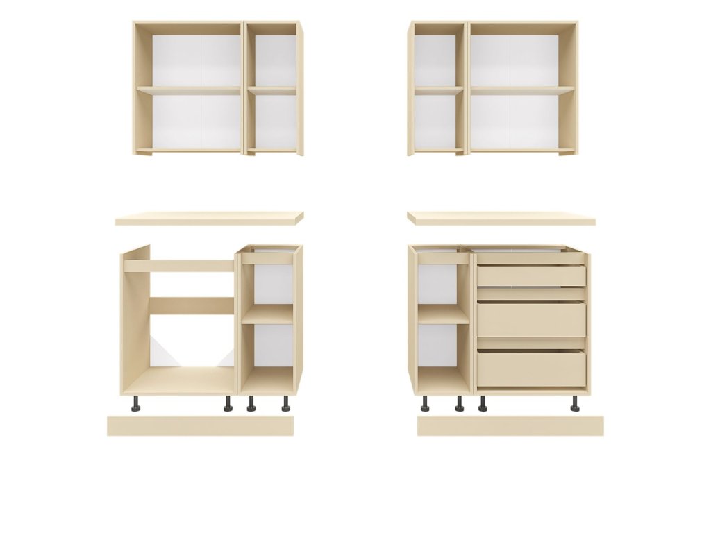 | Zostava obsahuje: | 2 ks horná dvojdverová skrinka 60 cm 2 ks horná jednodverová skrinka 30 cm 1 ks dolná dvojdverová drezová skrinka 60 cm 2 ks dolná jednodverová skrinka 30 cm |