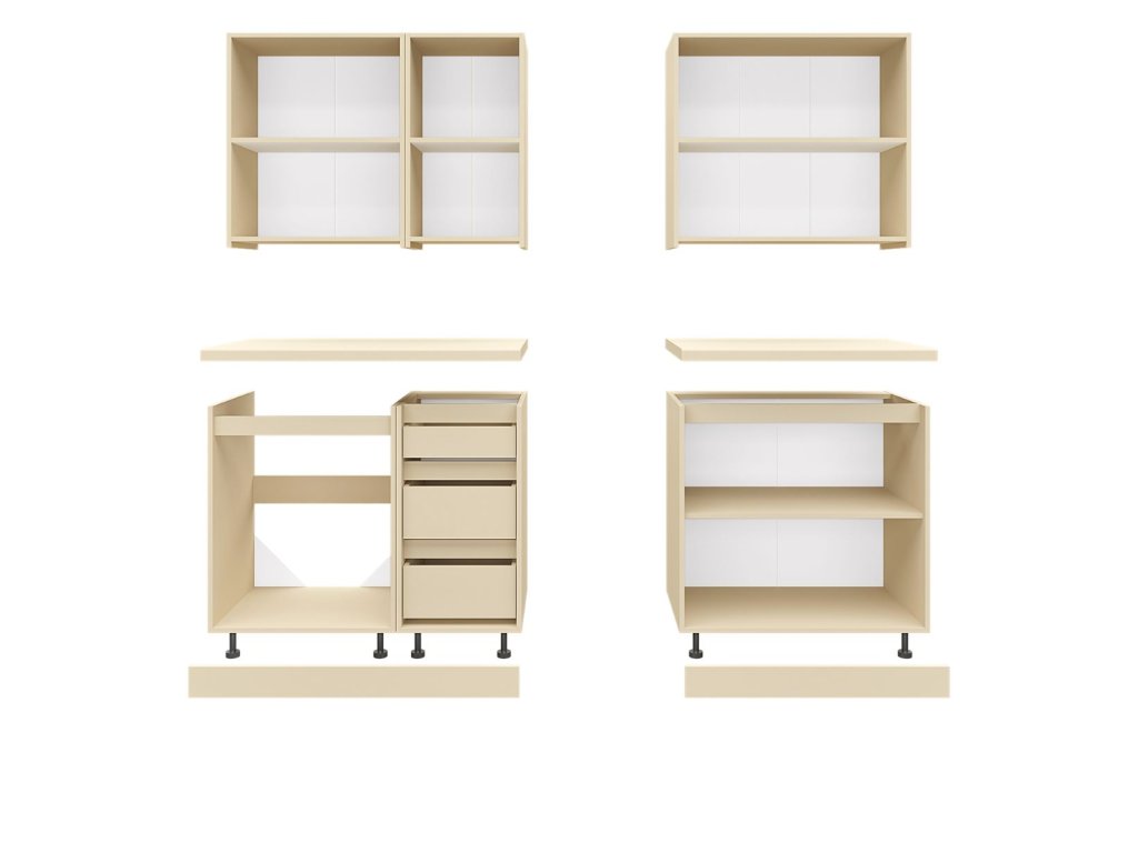 | Zostava obsahuje: | 1 ks horná dvojdverová skrinka 60 cm 1 ks horná jednodverová skrinka 40 cm 1 ks horná dvojdverová skrinka 80 cm 1 ks dolná dvojdverová drezová skrinka 60 cm 1 ks dolná skrinka 4 skrinka 80 cm |