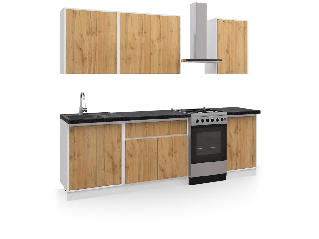 | Zostava obsahuje: | 1 ks horná dvojdverová skrinka 60 cm 1 ks horná dvojdverová skrinka 80 cm 1 ks horná jednodverová skrinka 50 cm 1 ks dolná dvojdverová drezová skrinka 60 cm 1 ks dolná skrinka so zásuvkami 80 cm 1 ks dolná dvojdverová skrinka 50 cm |