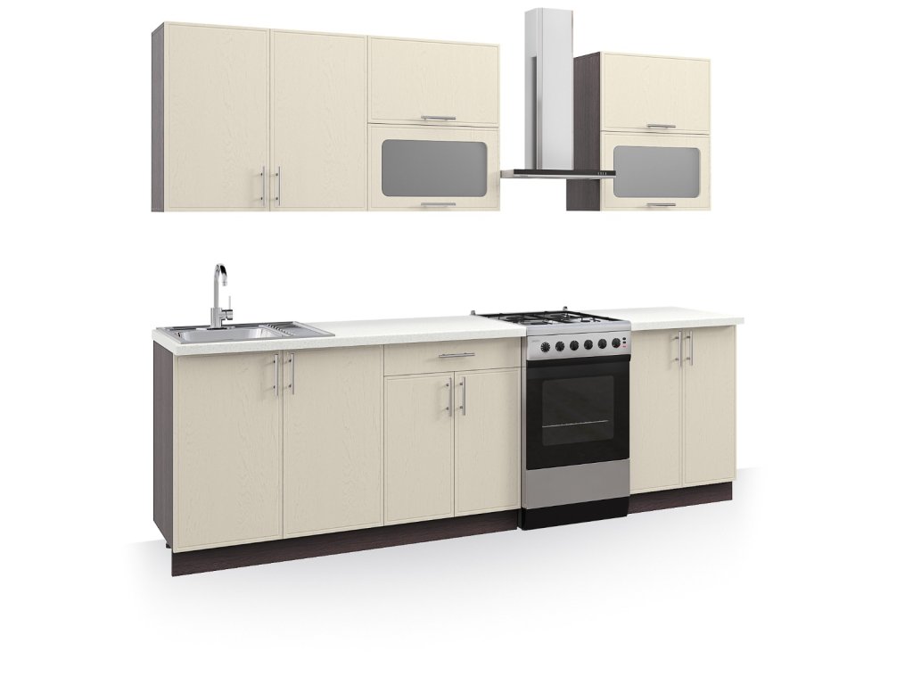 | Zostava obsahuje: | 1 ks horná dvojdverová skrinka 80 cm 1 ks horná dvojdverová skrinka s vitrínou 60 cm 1 ks horná jednodverová skrinka s vitrínou 60 cm 1 ks dolná dvojdverová drezová skrinka 80 cm 1 ks dolná skrinka so zásuvkami 60 cm 1 ks dolná dvojdverová skrinka 60 cm |