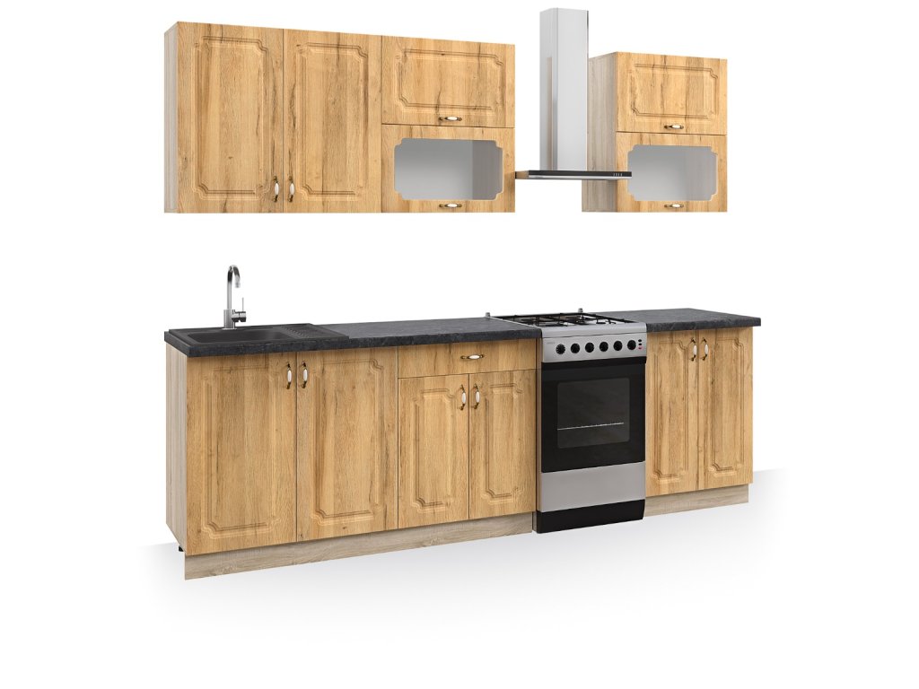 | Zostava obsahuje: | 1 ks horná dvojdverová skrinka 80 cm 1 ks horná dvojdverová skrinka s vitrínou 60 cm 1 ks horná dvojdverová skrinka s vitrínou 60 cm 1 ks dolná dvojdverová drezová skrinka 80 cm 1 ks dolná skrinka so zásuvkami 60 cm 1 ks dolná dvojdverová skrinka 60 cm |