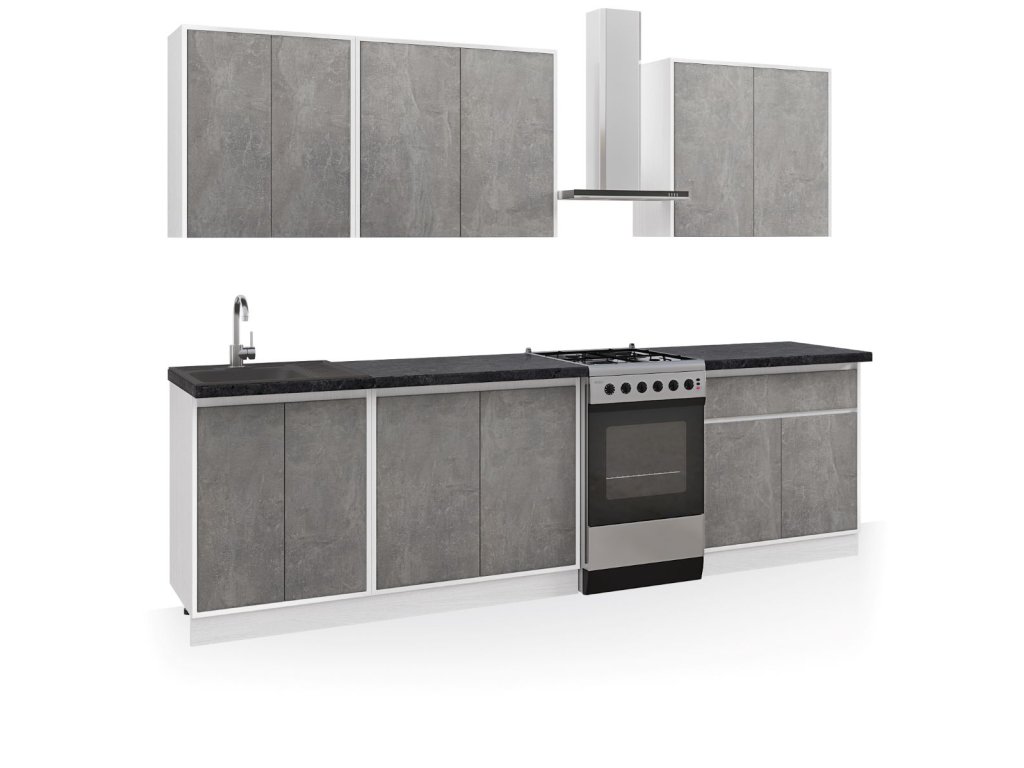 Kuchynská linka MATEO 220 je priestranná a napriek tomu mimoriadne cenovo dostupná. Kombinácia farieb betón a biela je veľmi žiadaná, jej moderný štýl podčiarkuje aj bezúchytový systém otvárania dvierok.