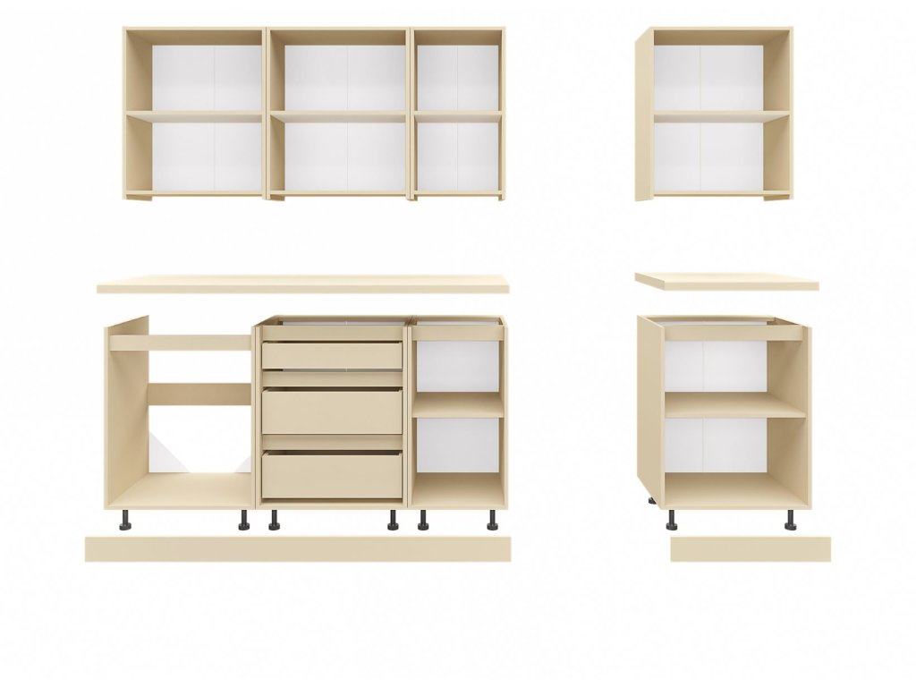 | Zostava obsahuje: | 3 ks horná dvojdverová skrinka 60 cm 1 ks horná jednodverová skrinka 40 cm 1 ks dolná dvojdverová drezová skrinka 60 cm 1 ks dolná dvojdverová skrinka 60 cm 1 ks dolná jednodvera skrinka so zásuvkami 60 cm |