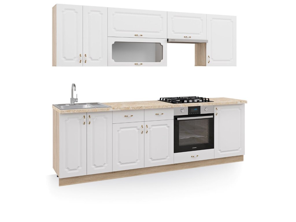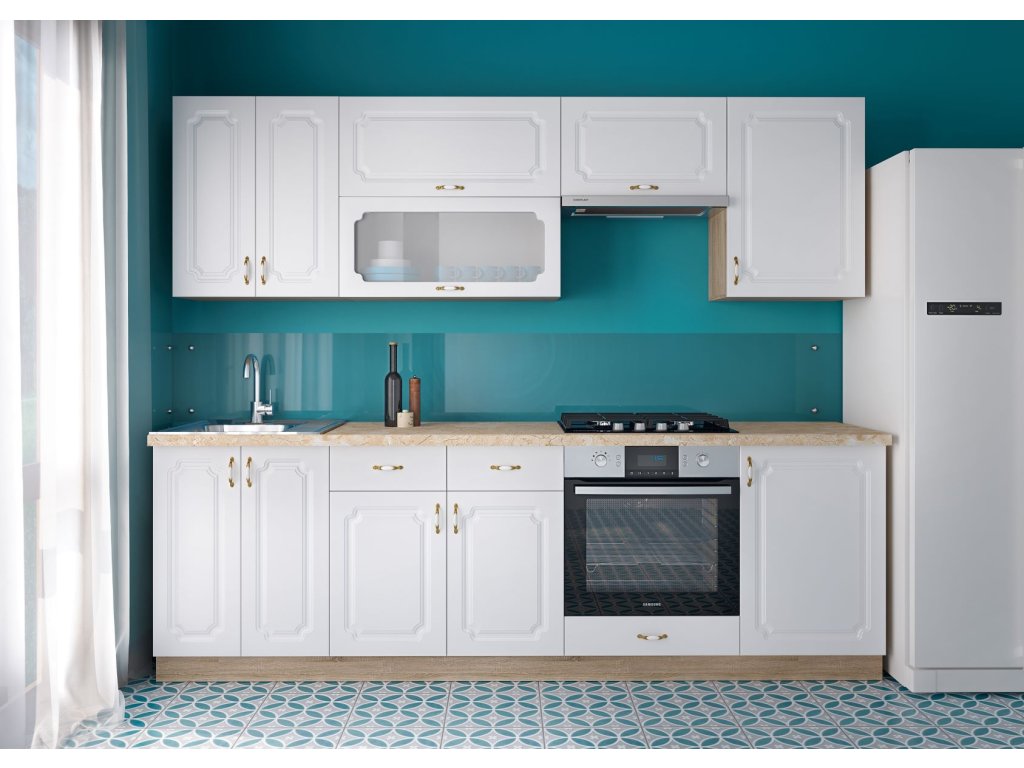 | Zostava obsahuje: | 1 ks horná dvojdverová 60 cm 1 ks horná dvojdverová s vitrínou 80 cm 1 ks horná digestorová 60 cm 1 ks horná jednodverová 50 cm 1 ks dolná drezová 60 cm 1 ks dolná dvojdverová so zásuvkami 8 |