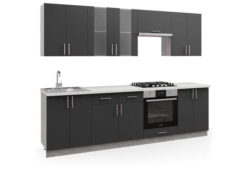 Kuchynská linka FORESTA 260 je priestranným a moderným riešením pre veľké kuchyne, kde je kladený dôraz na funkčnosť, prehľadné usporiadanie a dostatok úložného priestoru. Vďaka veľkorysej šírke zostavy ponúka komfort pri každodennom varení aj príprave jedál. Kontrastná farebná kombinácia antracit + betón pôsobí industriálne, nadčasovo a skvelo zapadne do moderných interiérov.