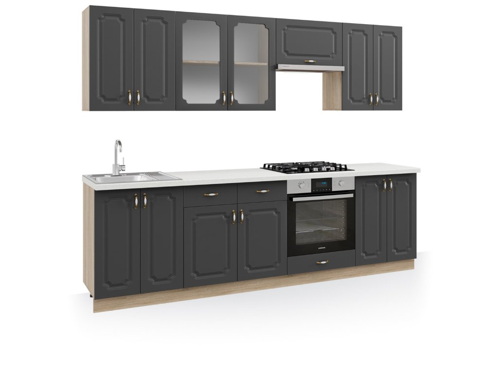 Kuchynská linka MADONNA 260 je priestranným a elegantným riešením pre väčšie kuchyne, kde chcete spojiť vysokú funkčnosť s výrazným vintage a retro štýlom. Nadčasová kombinácia farieb kremenec + dub Sonoma vytvára útulnú atmosféru a dodáva kuchyni klasický charakter s dôrazom na detail a estetiku.