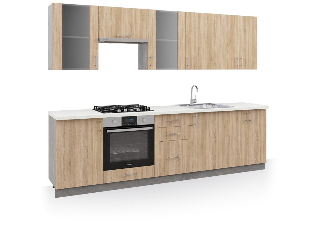 V cene kuchyne je sokel. Výška horných skriniek je 72 cm, hĺbka je 32 cm. Výška dolných skriniek je 82 cm, hĺbka je 60 cm (vnútorná 47 cm).Zostava obsahuje: