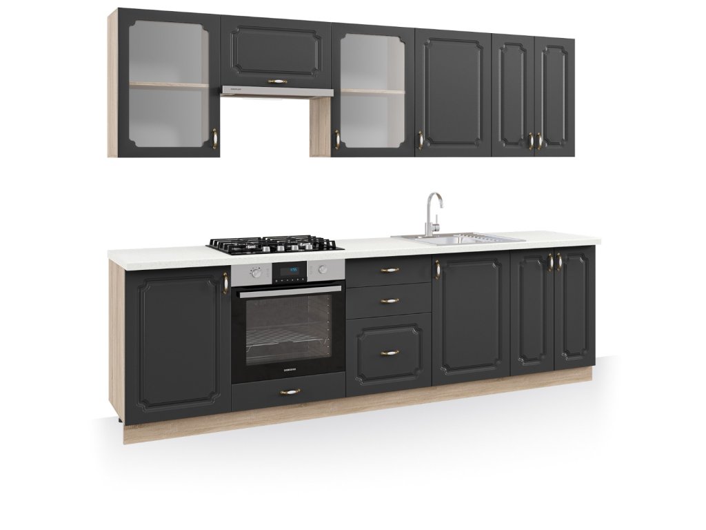 | Zostava obsahuje: | 2 ks horná skrinka s vitrínou 50 cm 1 ks horná skrinka na digestor 60 cm 1 ks horná jednodverová skrinka 50 cm1 ks 1 ks horná dvojdverová skrinka 60 cm 1 ks dolná dvojdverová skrinka 50 cm 1 ks dolná skrinka na vstavanú rúru 60 cm 1 ks dolná skrinka so zásuvkami 50 cm 1 ks dolná dvojdverová drezová skrinka 50 cm 1 ks dolná dvojdverová skrinka 60 cm |