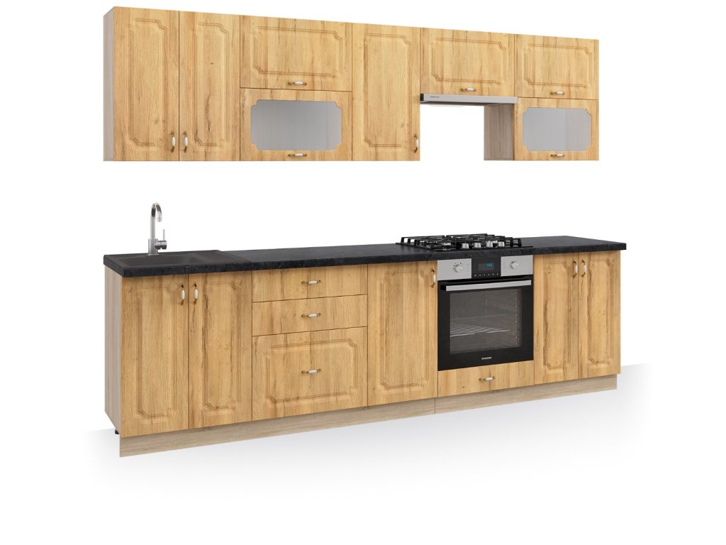 | Zostava obsahuje: | 1 ks horná dvojdverová skrinka 60 cm 1 ks horná dvojdverová skrinka s vitrínou 60 cm 1 ks horná skrinka na digestor 60 cm 1 ks horná jednodverová skrinka 40 cm 1 ks horná dvojdverová skrinka s vitrínou 60 cm 1 ks dolná dvojdverová drezová skrinka 60 cm 2 ks dolná skrinka so zásuvkami 60 cm 1 ks dolná dvojdverová skrinka 40 cm 1 ks dolná skrinka na vstavanú rúru 60 cm |