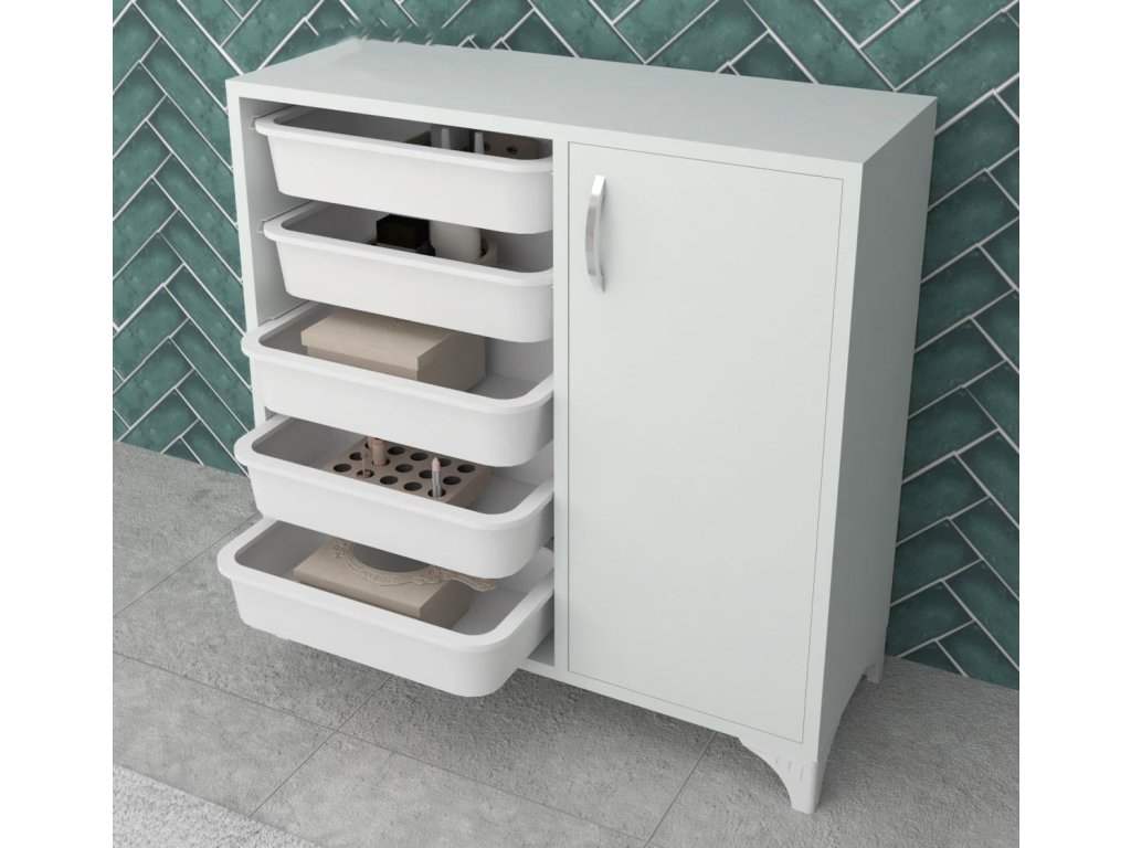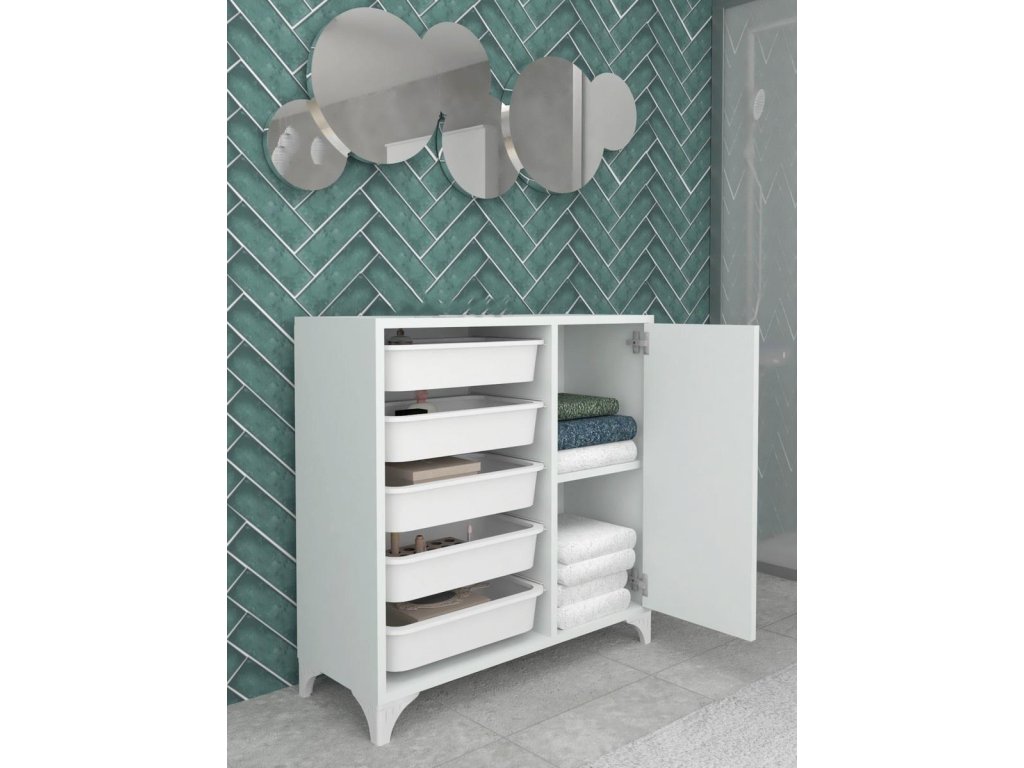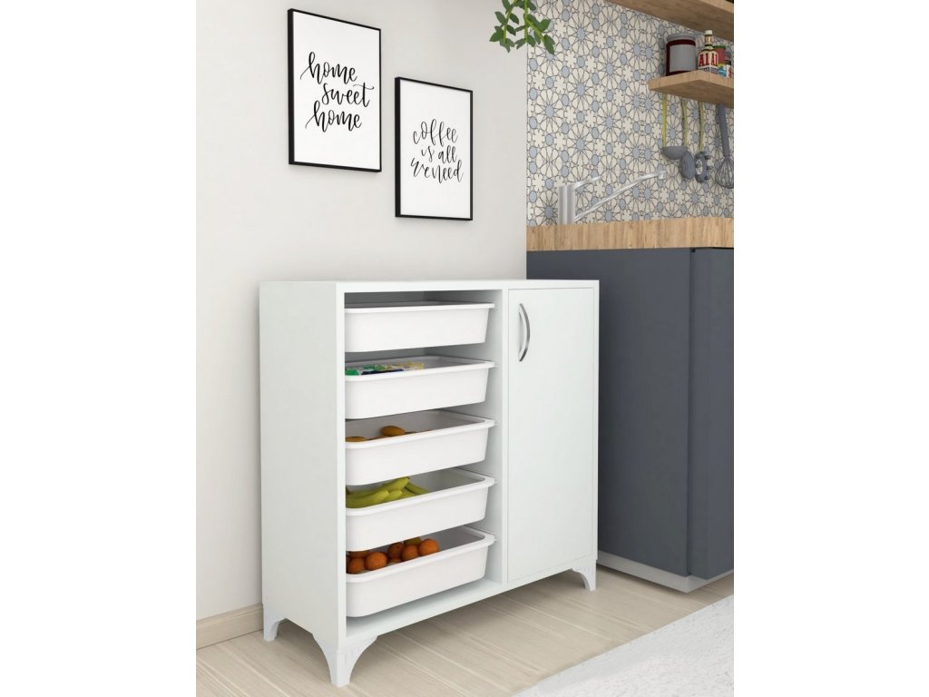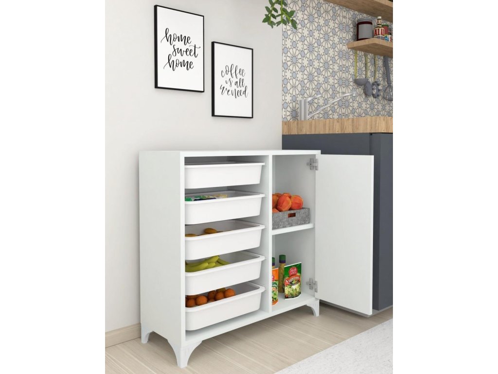 Skrinka je vyrobená z kvalitnej LTD dosky, ktorá je nenáročná na údržbu. Disponuje piatimi samostatnými košmi na uloženie ovocia, zeleniny a podobne. Koše a koľajničky sú vyrobené z kvalitného PP plastu v bielom farebnom prevedení. cm