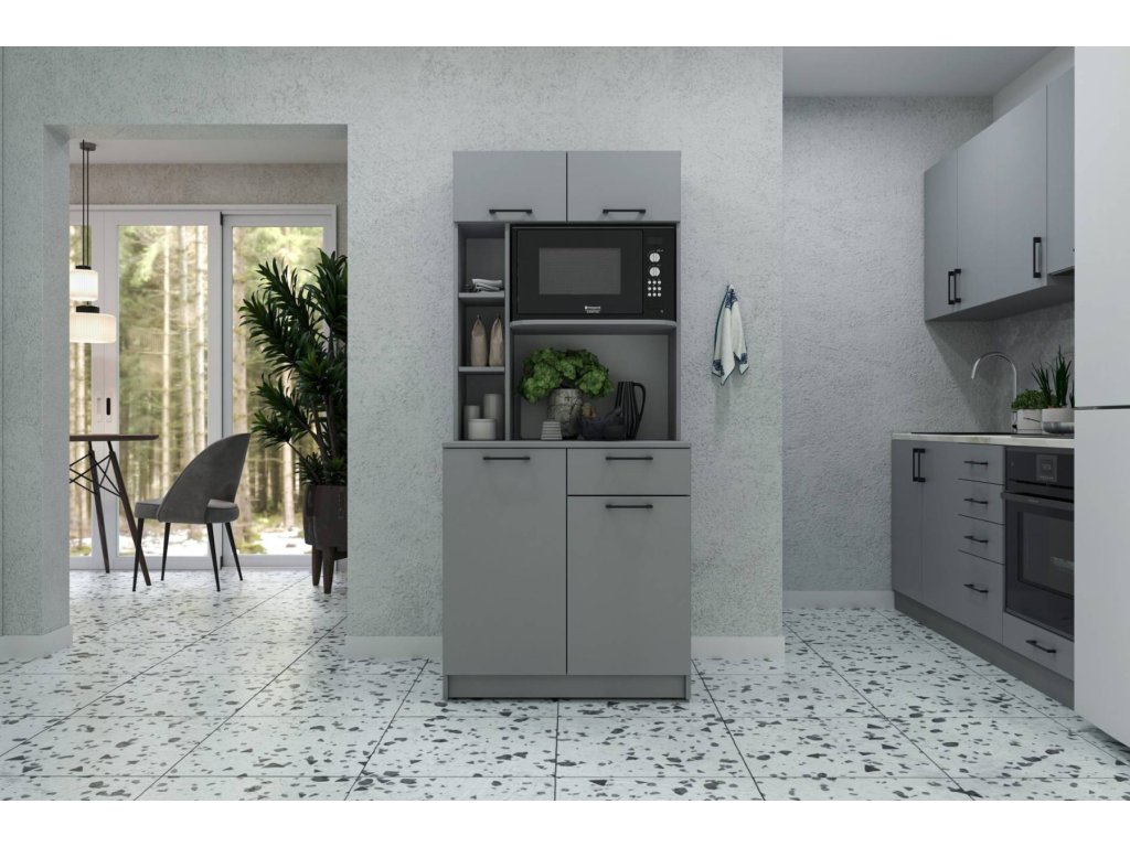 CAPSULE samostatná kuchynská skrinka je ideálnym kúskom do vašej kuchyne, ktorá poslúži na zväčšenie úložného priestoru av kuchyni pôsobí štýlovo a nadčasovo. otvorenými policami, praktickým priestorom pre mikrovlnnú rúru a výsuvnými policami na odkladanie vecí CAPSULE kombinuje funkčnosť a moderný dizajn a harmonicky dopĺňa akýkoľvek interiér.