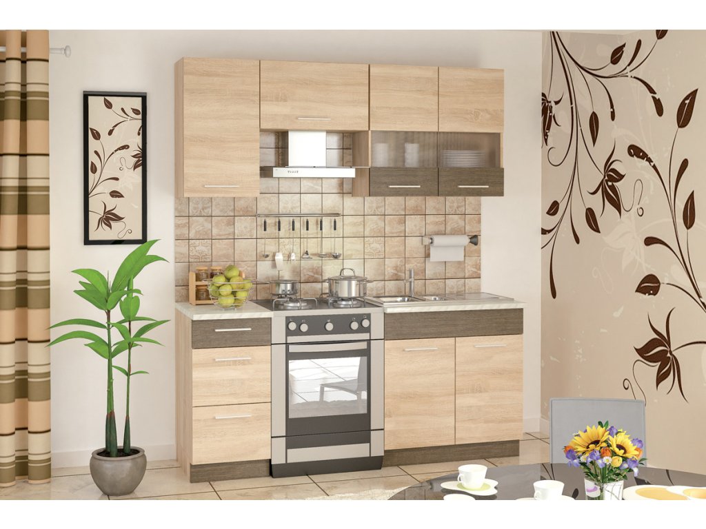 | Zostava obsahuje: | horná 1-dverová 40, horná 1-dverová s výklopným systémom nad digestor 60, horná 2-dverová so sklom 80, dolná s 3 zásuvkami 40, dolná 2-dverová 80 pod drez |