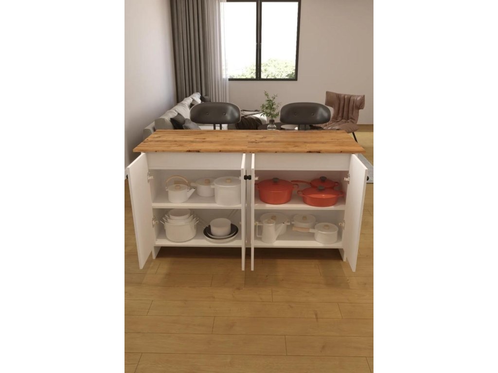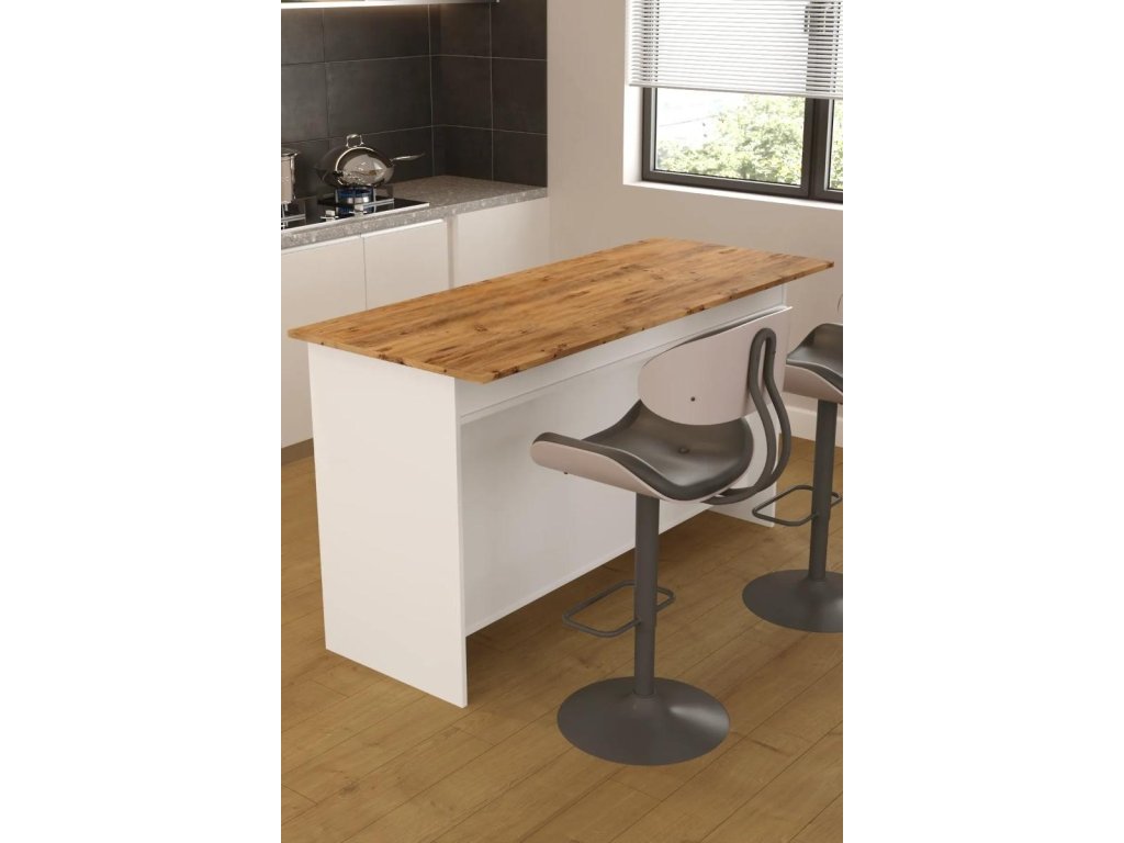 Kuchynský ostrovček s funkciou barového aj jedálenského stola so skrinkou, viacúčelový nábytok s rozmerom 160 × 65 cm.