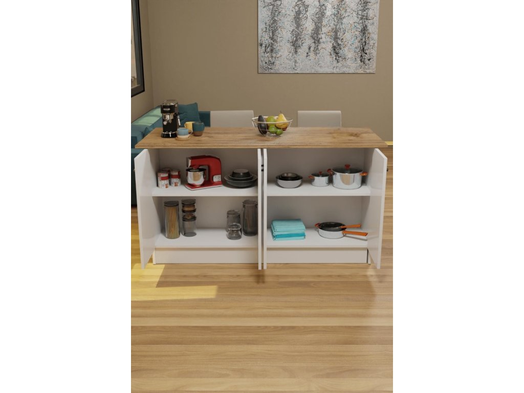 Ostrovček VERRI disponuje 4 dvierkami, za ktorými sa nachádza 2 x 1 priestranná polica na uskladnenie vašich kuchynských potrieb. Vyrobený z kvalitnej drevotriesky potiahnutej melamínom, kuchynský ostrovček VERRI zaisťuje dlhú životnosť a odolnosť.