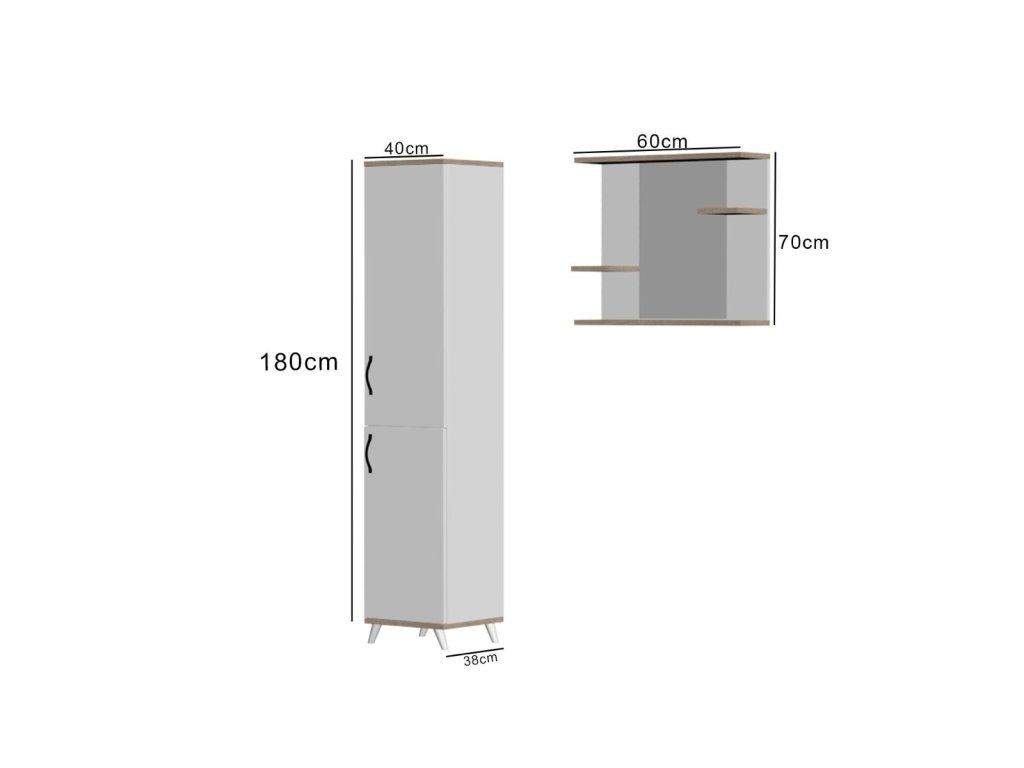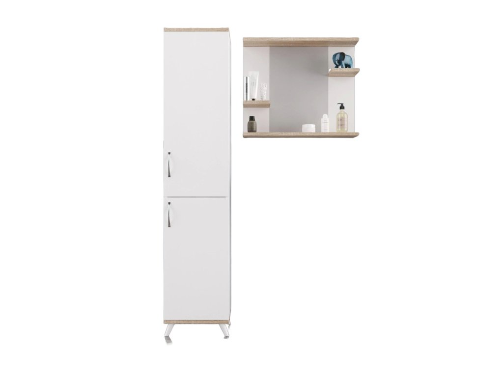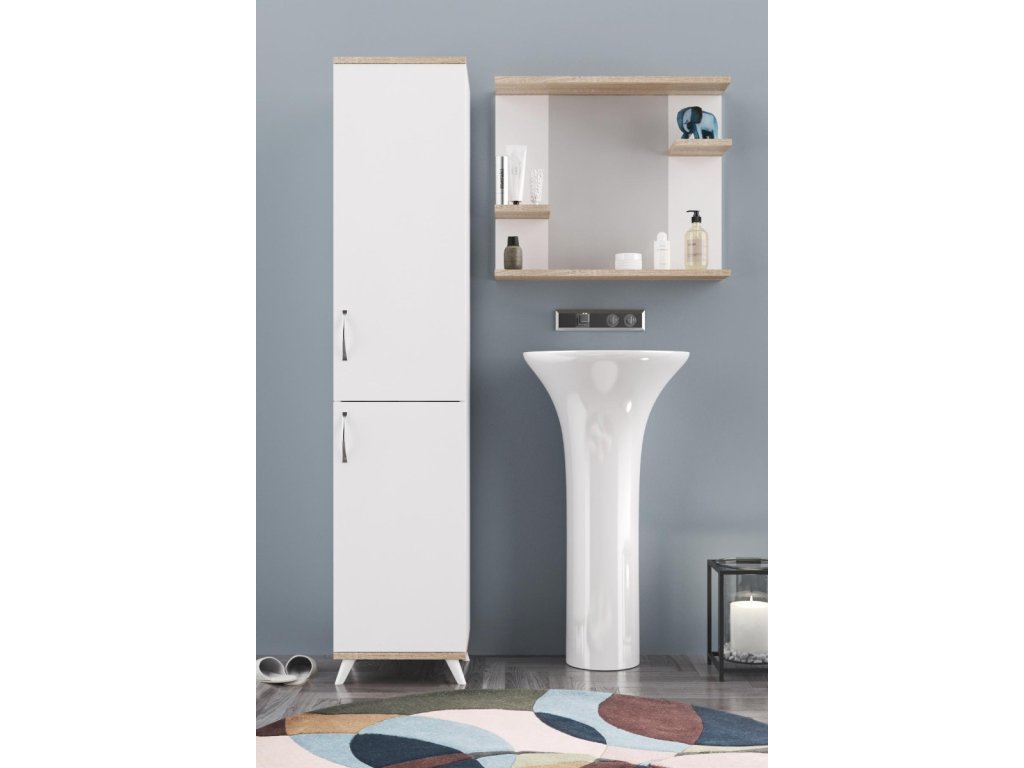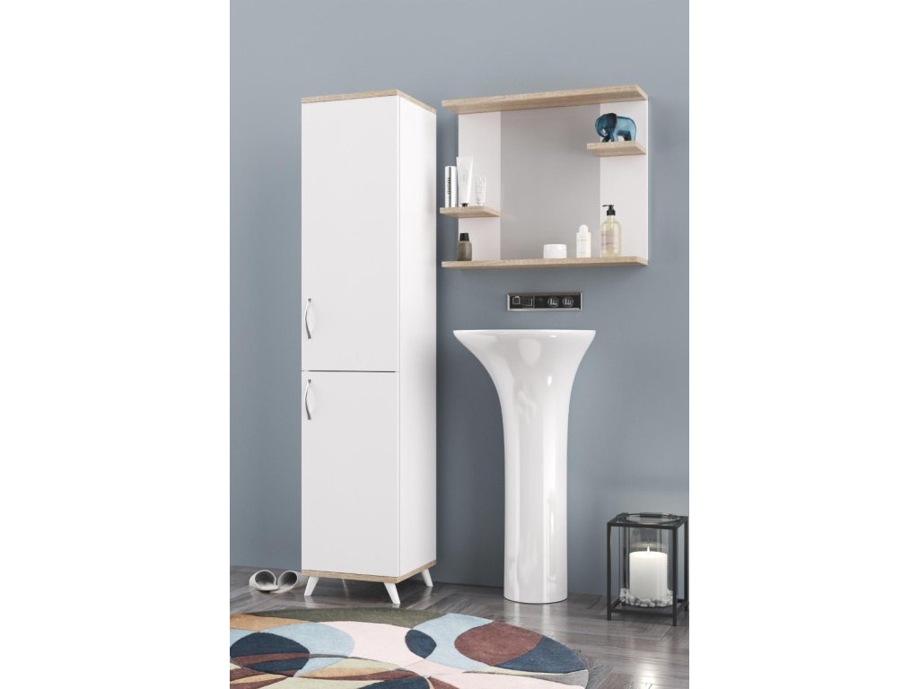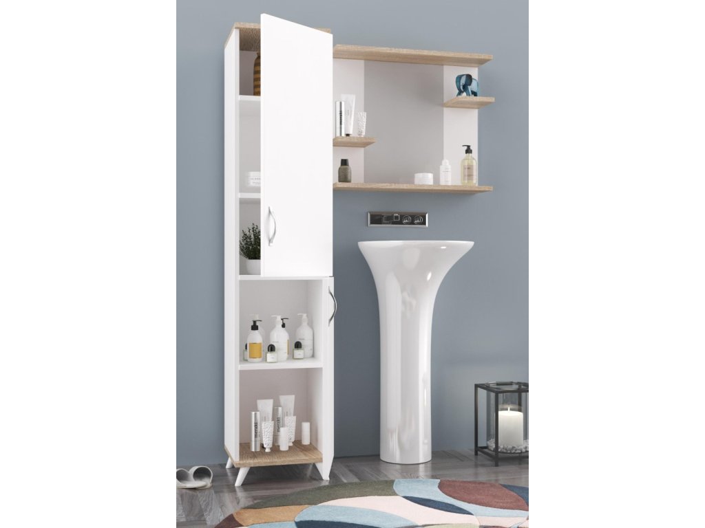 Policová skriňa stojí na elegantných nožičkách, čo uľahčuje údržbu podlahy pod ňou. Na paneli s poličkami je aj zrkadlo nech sa môžete pozrieť ako vám to pristane. Vyrobená z kvalitnej drevotriesky potiahnutej melamínom, kúpeľňová zostava RAYEN zaisťuje dlhú životnosť a odolnosť. Umývadlo nie je súčasťou zostavy.