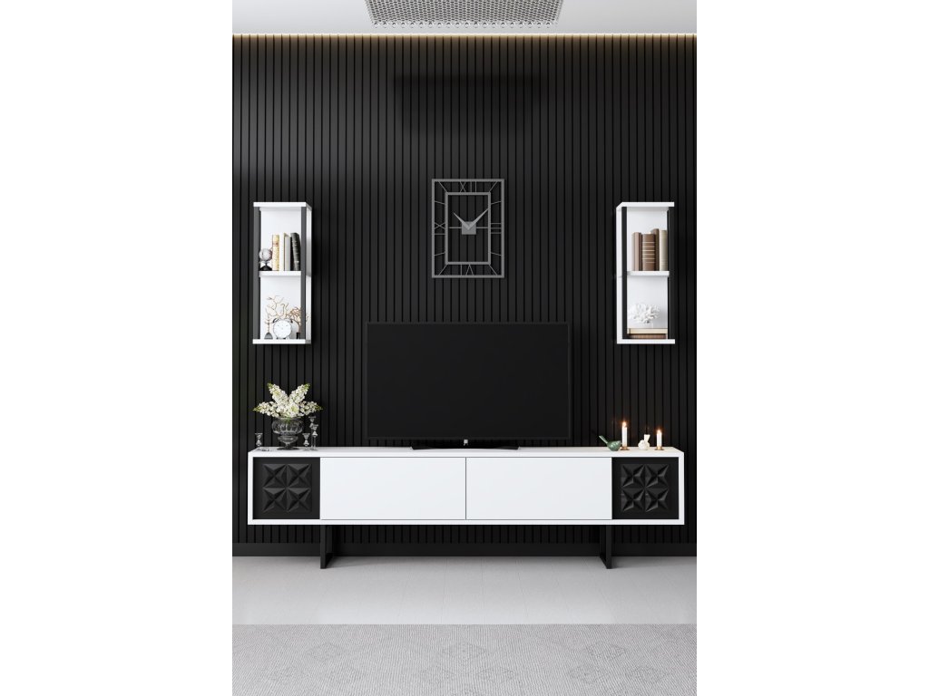 S televíznym stolíkom s rozmermi 180 cm na šírku, 30 cm na hĺbku a 48 cm na výšku poskytuje tento stolík dostatok. Dve nástenné police, každá so šírkou 22 cm, hĺbkou 21 cm a výškou 60 cm, ponúkajú ďalší úložný priestor pre vystavenie dekoratívnych predmetov alebo organizácii vašej zbierky médií. obývacej izbe. Kontrastné farby vytvárajú vizuálne atraktívny ústredný bod, vďaka čomu je táto skriňa štýlovým doplnkom vášho domova. mm