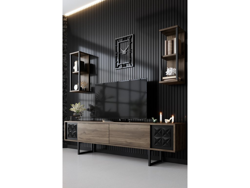 Táto televízna skrinka s elegantnými kovovými nohami dodá každému priestoru nádych modernej elegancie. Výška nôh 18 cm vytvára efekt vznášania, ktorý dodá vašej obývačke priestranný a moderný vzhľad. Kombinácia orechovej a čiernej farby dodá vášmu dekoru sofistikovaný nádych a dokonale sa hodí do akéhokoľvek interiéru. televíziu a ďalšie zábavné zariadenia. Dve nástenné police, každá so šírkou 22 cm, hĺbkou 21 cm a výškou 60 cm, ponúkajú ďalší úložný priestor pre vaše knihy, DVD alebo dekoratívne predmety. Udržiavajte svoju obývaciu izbu organizovanú a bez neporiadku s touto funkčnou televíznou skrinkou. 18 cm