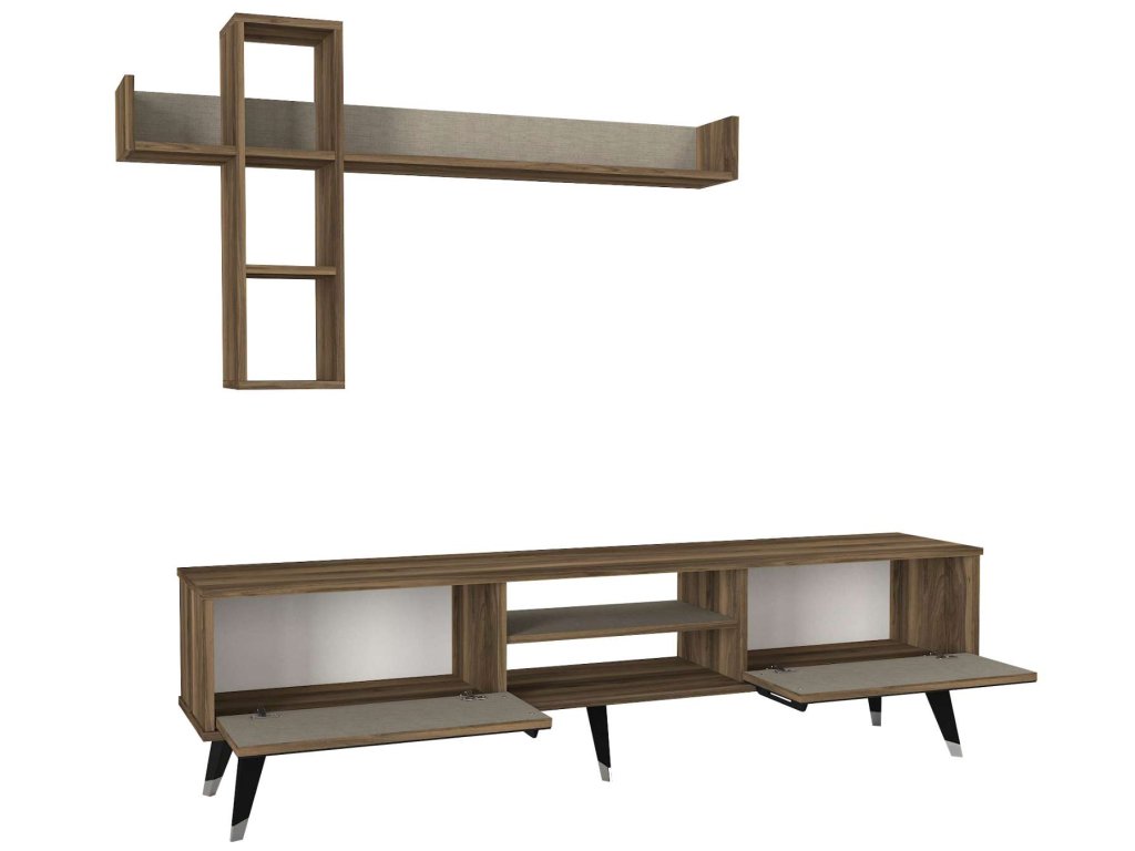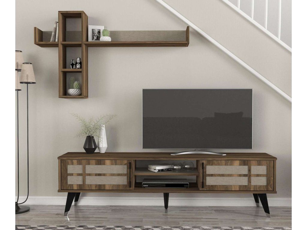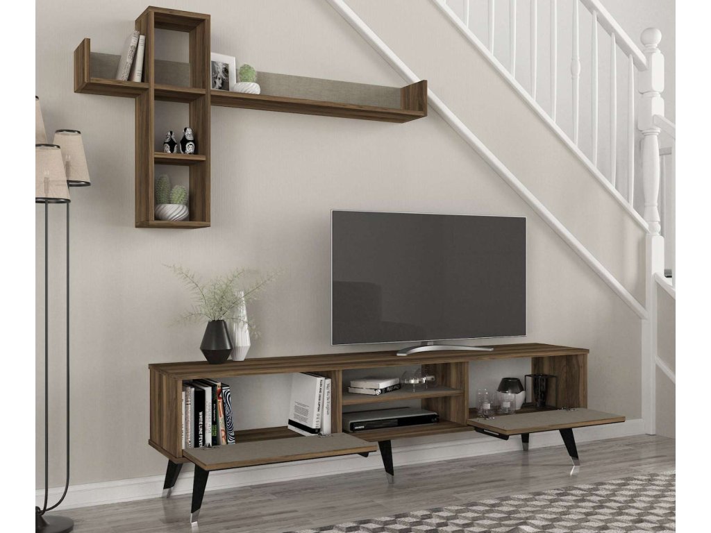 - Rozmery: TV stolík (180 x 35 x 49,2 cm) a horný modul (135,2 x 19,68 x 75,6 cm), poskytujúci dostatočný úložný priestor a zároveň slúžiaci ako dekoratívny prvok.