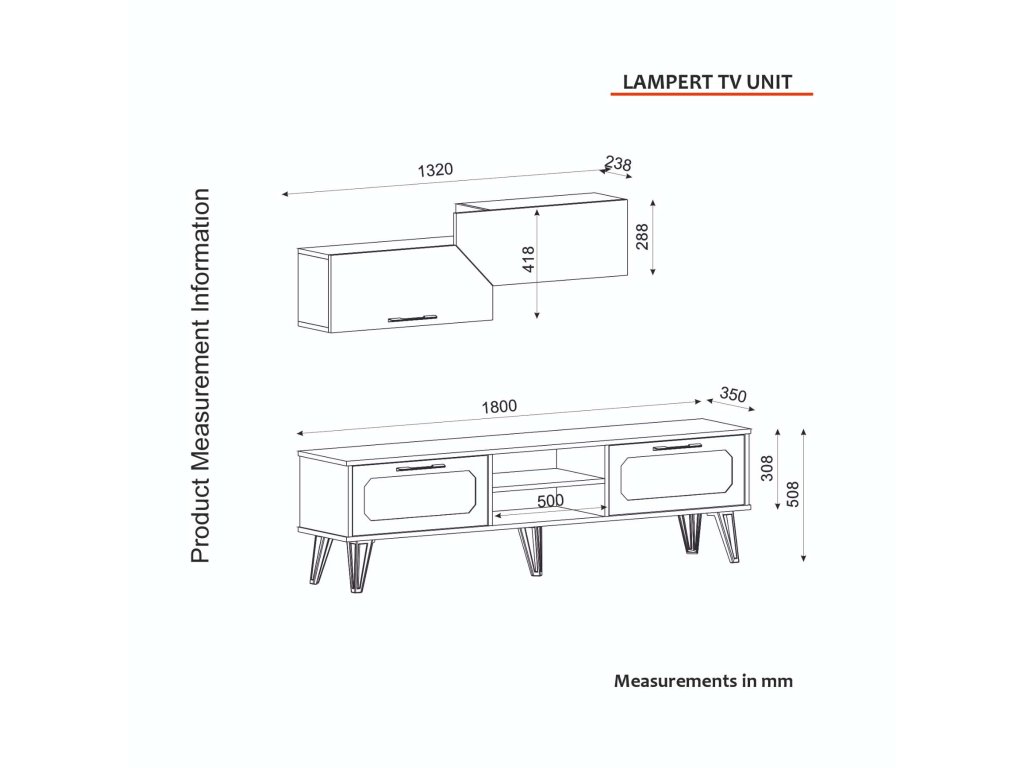 - Rozmery: TV stolík (180 x 35 x 50.8 cm) a nástenná polica (132 x 23.8 x 41.8 cm) poskytujú bohatý priestor pre vašu multimediálnu techniku a dekorácie.