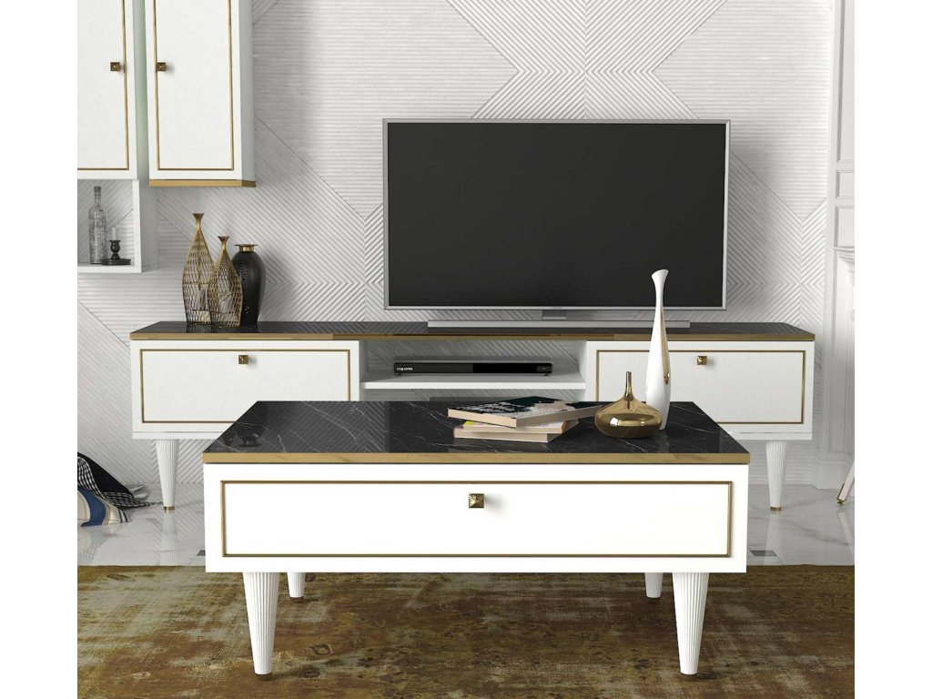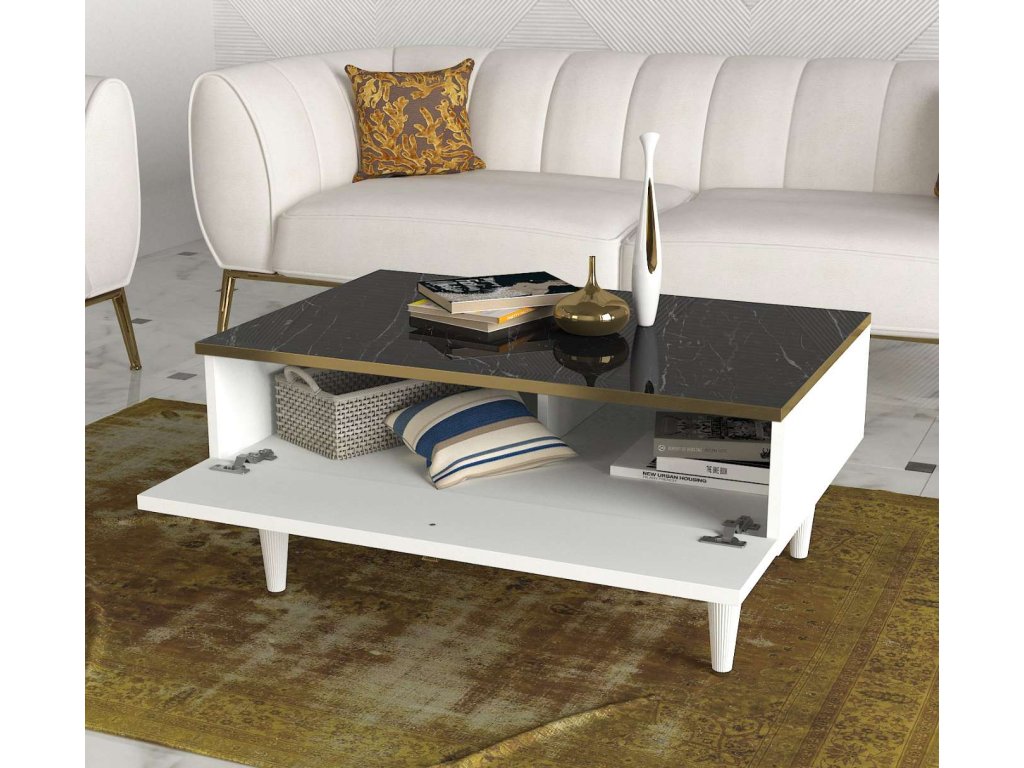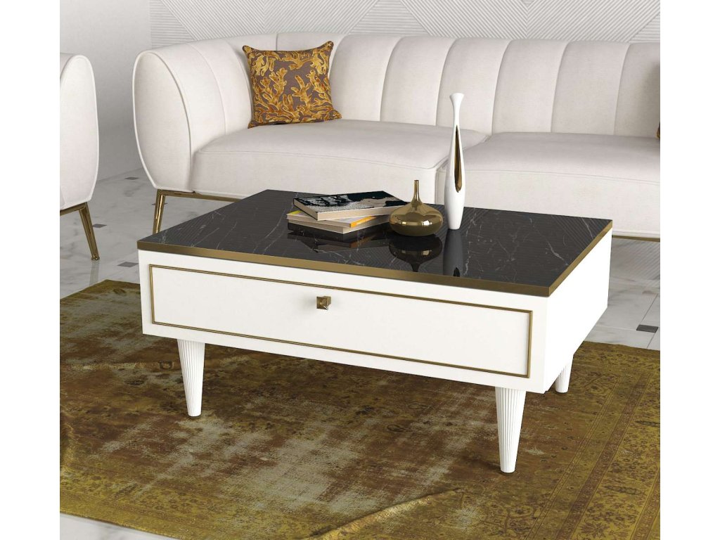 Predstavujeme RAVEN, luxusný konferenčný stolík, ktorý prináša do vašej obývačky eleganciu a moderný dizajn. Tento štýlový nábytok v kombinácii bielej a mramorovej farby je navrhnutý tak, aby poskytoval praktické a estetické riešenie pre vaše potreby.