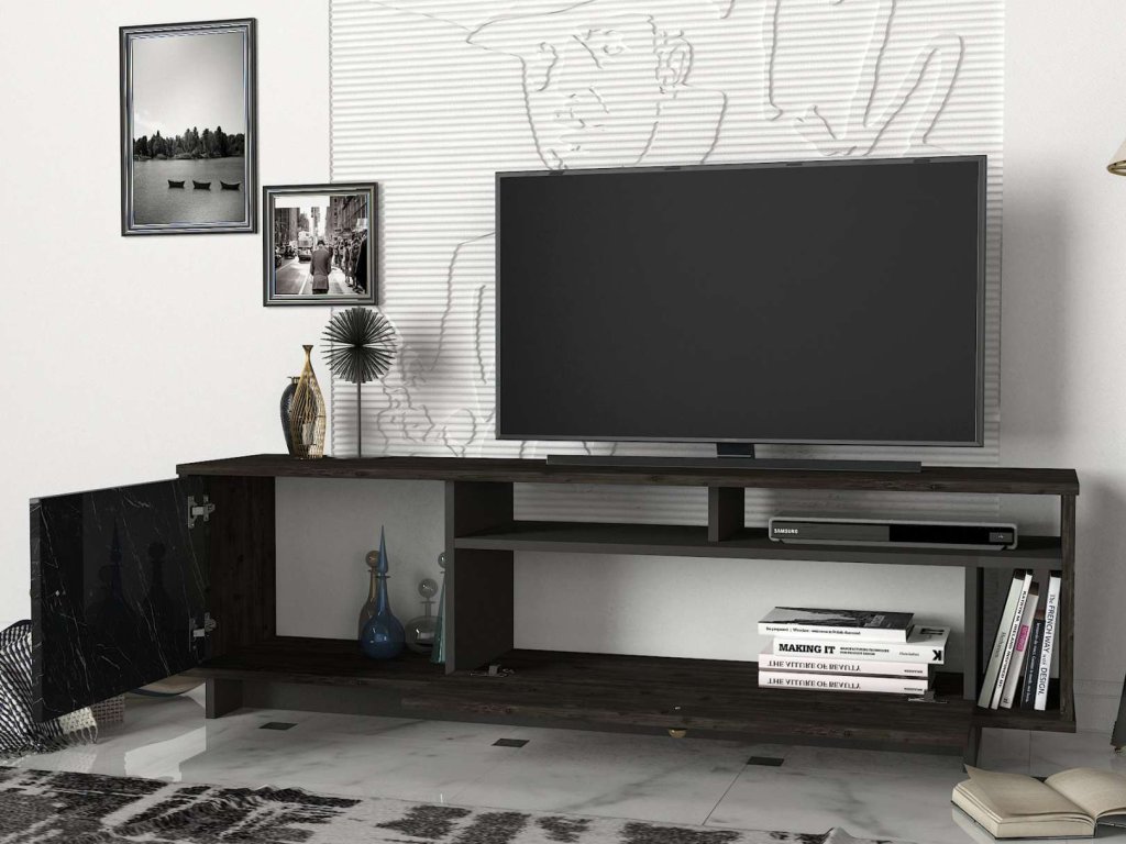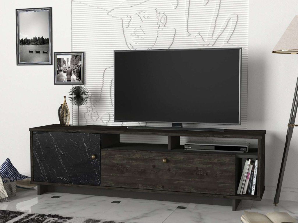 TV stolík TERMA je ideálnou voľbou pre tých, ktorí hľadajú luxusný a funkčný nábytok s elegantným vzhľadom. Jeho kombinácia tmavo hnedej a mramorovej farby a minimalistický dizajn prinášajú do vášho domova sviežosť a moderný štýl, zatiaľ čo poskytujú dostatok úložného priestoru pre všetky vaše potreby.