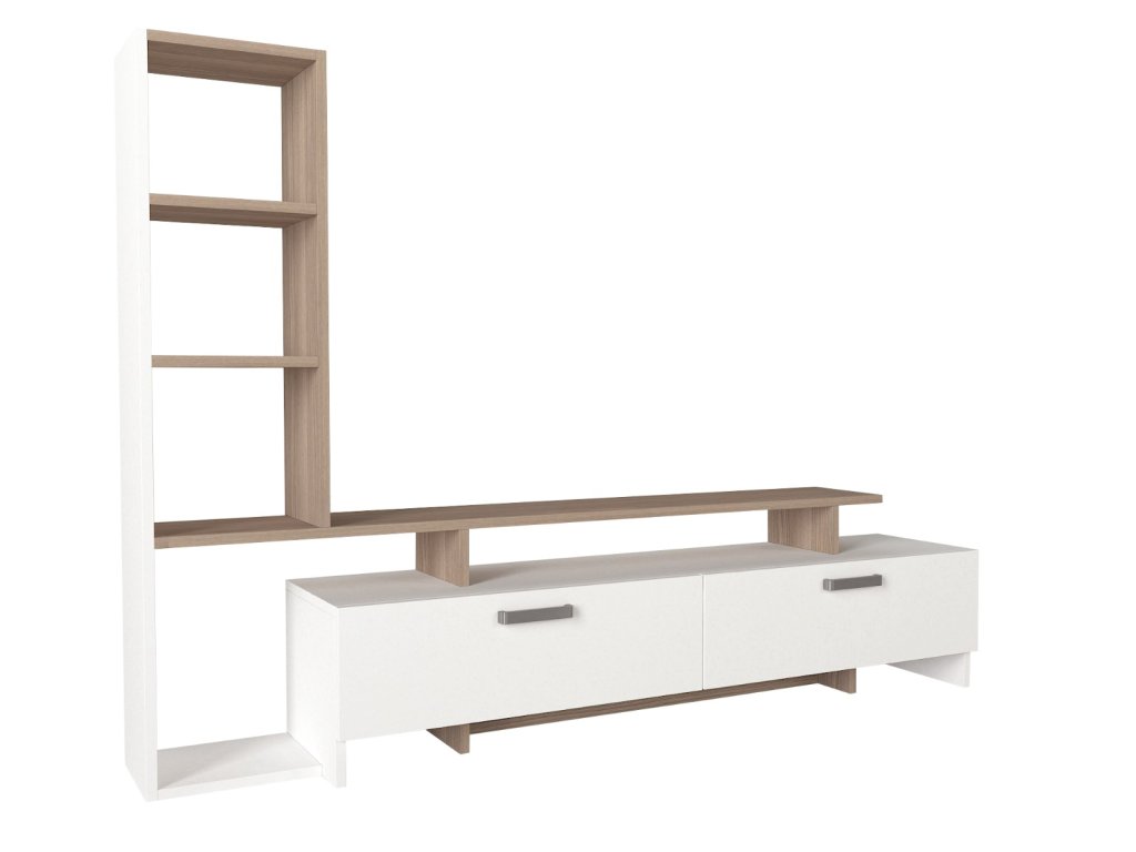 Jednoduchá a malá obývacia stena JAMAL je v modernom prevedení a zaujímavom tvare. Vďaka svojim rozmerom sa skvele hodí do malých interiérov. TV stena obsahuje praktický regál, ktorý poskytuje dostatok úložného priestoru na odloženie kníh a dekorácií. Rovnako dobre poslúži aj spodná výklopná skrinka.