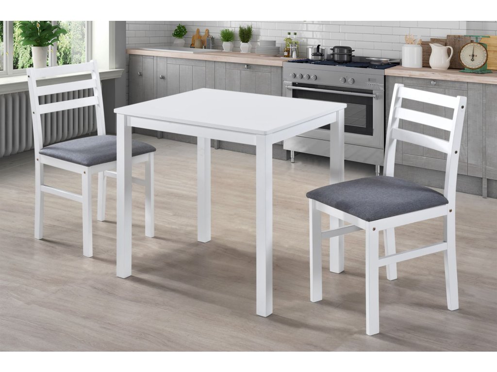 Elegantný jedálenský set SEATTLE zútulní vašu kuchyňu či jedáleň. Vďaka svojim kompaktným rozmerom je ideálny do malých oriestorov. Nájdete ho v príjemnom bielom prevedení. Sedák stoličky je čalúnený v sivom farebnom prevedení. Klasika, ktorá dodá vášmu domovu pocit harmónie a naplní ho hrejivou atmosférou.