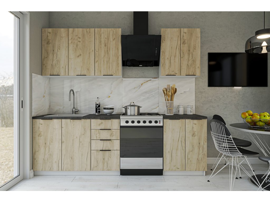 | Zostava obsahuje: | horná skrinka 80/72 cm, horná skrinka 40/72 cm, horná skrinka 60/72 cm, dolná skrinka drezová 80/82 cm, dolná skrinka 60/82 cm, dolná skrinka zásuvková 40/8 |