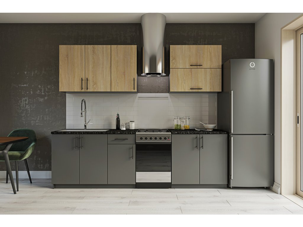 Kuchynské skrinky sú vyrobené z kvalitných LTD dosiek. Ich údržba je nenáročná. Korpus je vo farbe grafitu. Dvierka sú vo farbe dub Sonoma, antracit. Úchyty, ktoré sú v cene sú plastové, v čiernej farbe.