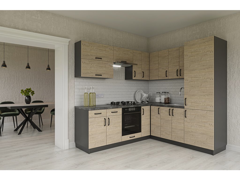 Dvierka kuchynských skriniek sú vyrobené z LTD dosiek. Ich údržba je nenáročná. Korpus je vo farbe grafitu. Dvierka sú vo farbe dub prímorský. Úchyty sú v čiernej farbe.