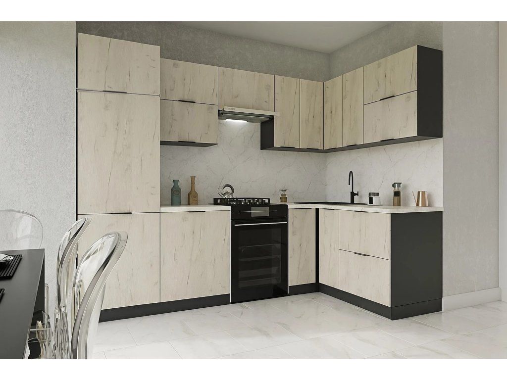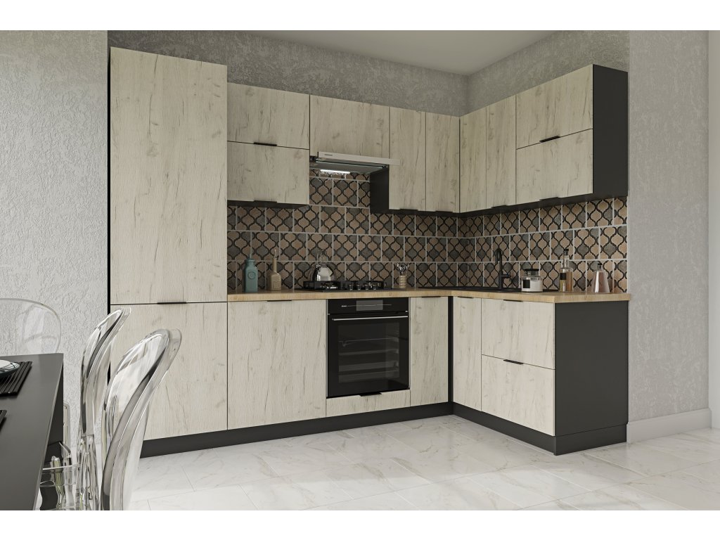 | Zostava obsahuje: | dolná skrinka 60/82, dolná skrinka 40/82, rohová drezová skrinka 80/82, dolná skrinka 60/82, 4 x horná skrinka 60/36, horná skrinka 60/42, horná sk 60/72, horná skrinka 30/72, vysoká skrinka 60/214 cm |
