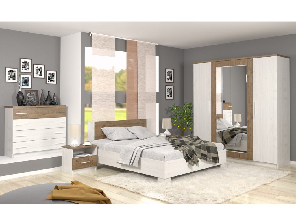 | Zostava obsahuje: | Manželská posteľ 180: 85/186/204 cm, nočný stolík, 2ks: 45,5/51/37 cm, šatníková skriňa so zrkadlom: 214/201/58, komoda so 4-šuplíkmi: 92/103/4 |