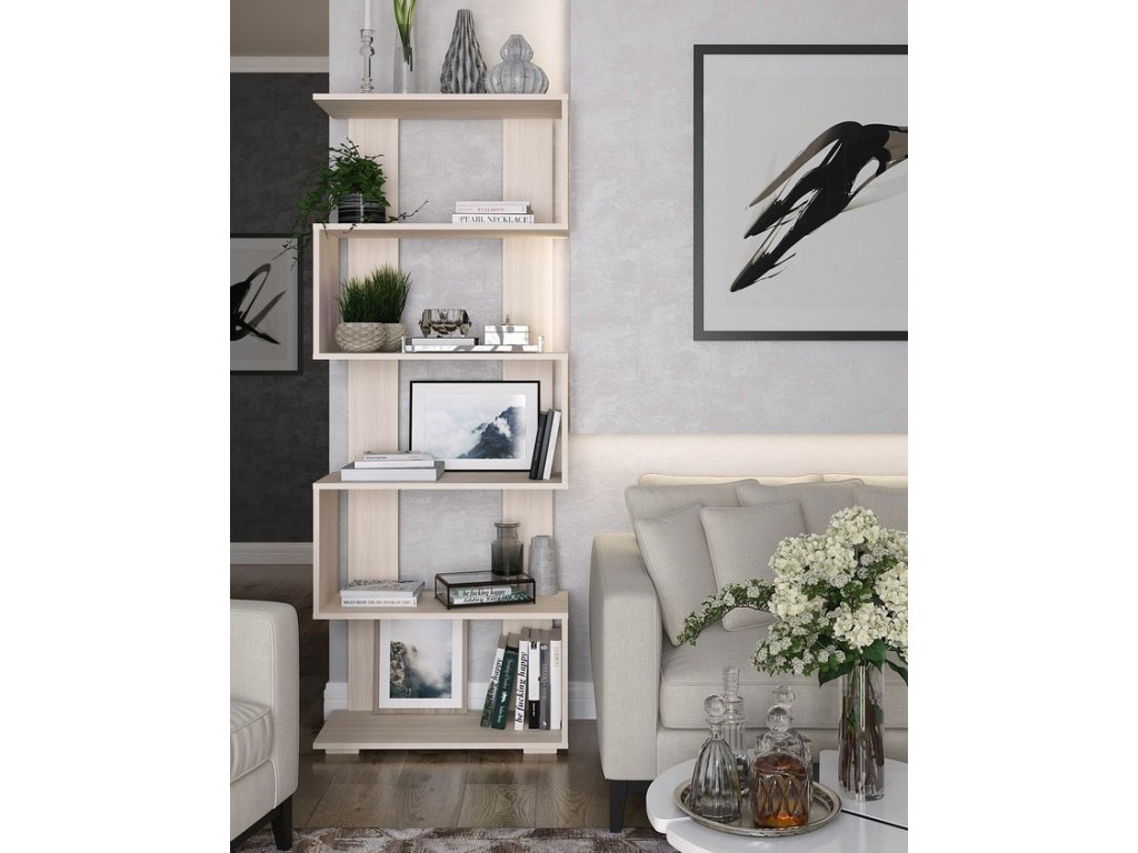Moderný dizajnový regál REGGI 2 ozvláštni a oživí každý interiér. Regál ponúka bohatý odkladací priestor, ktorý Vám poslúži na uloženie kvetín, kníh, darčekových či spomienkových predmetov. Farebné prevedenie je svieži dub mliečny.