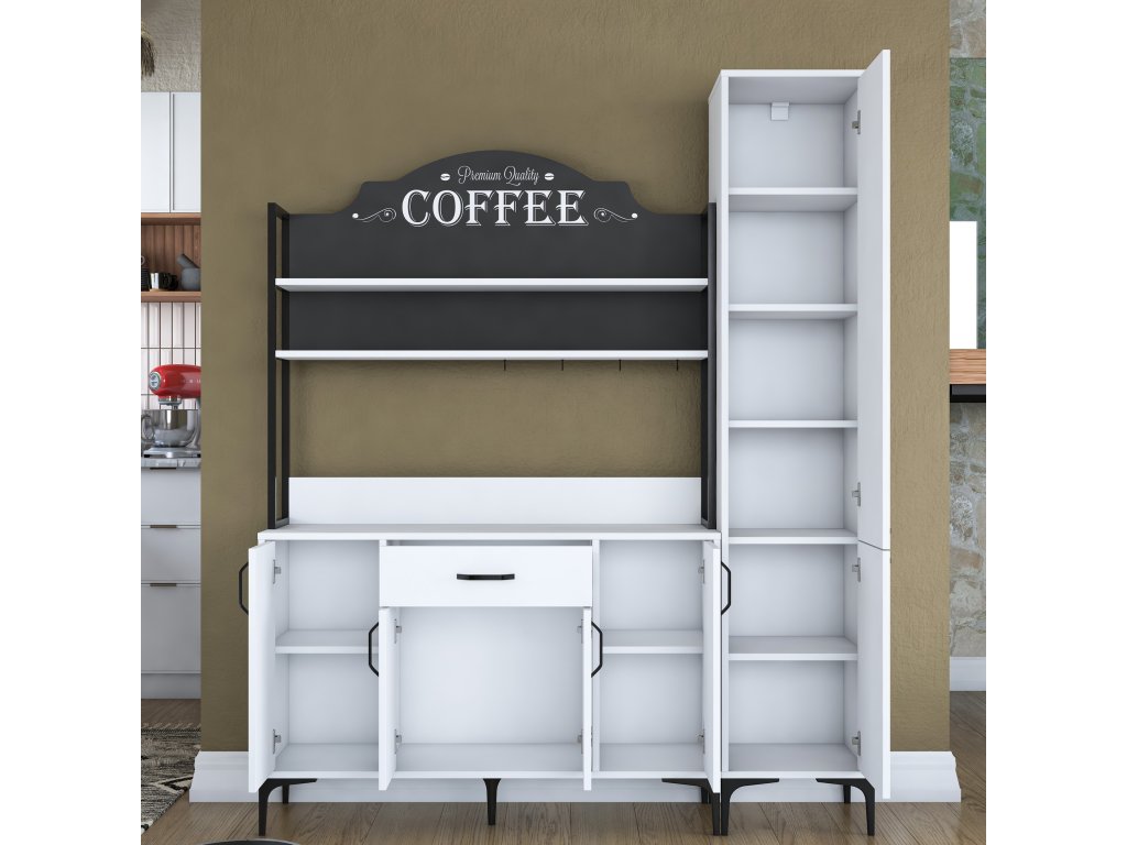 Skriňa CAPTAIN je vybavená šiestimi plnými dvierkami, zásuvkou a otvoreným regálom, čo ponúka široké možnosti uloženia kuchynských potrieb, riadu alebo spotrebičov. Jej vysoký dizajn efektívne využíva priestor a zaisťuje praktické usporiadanie.