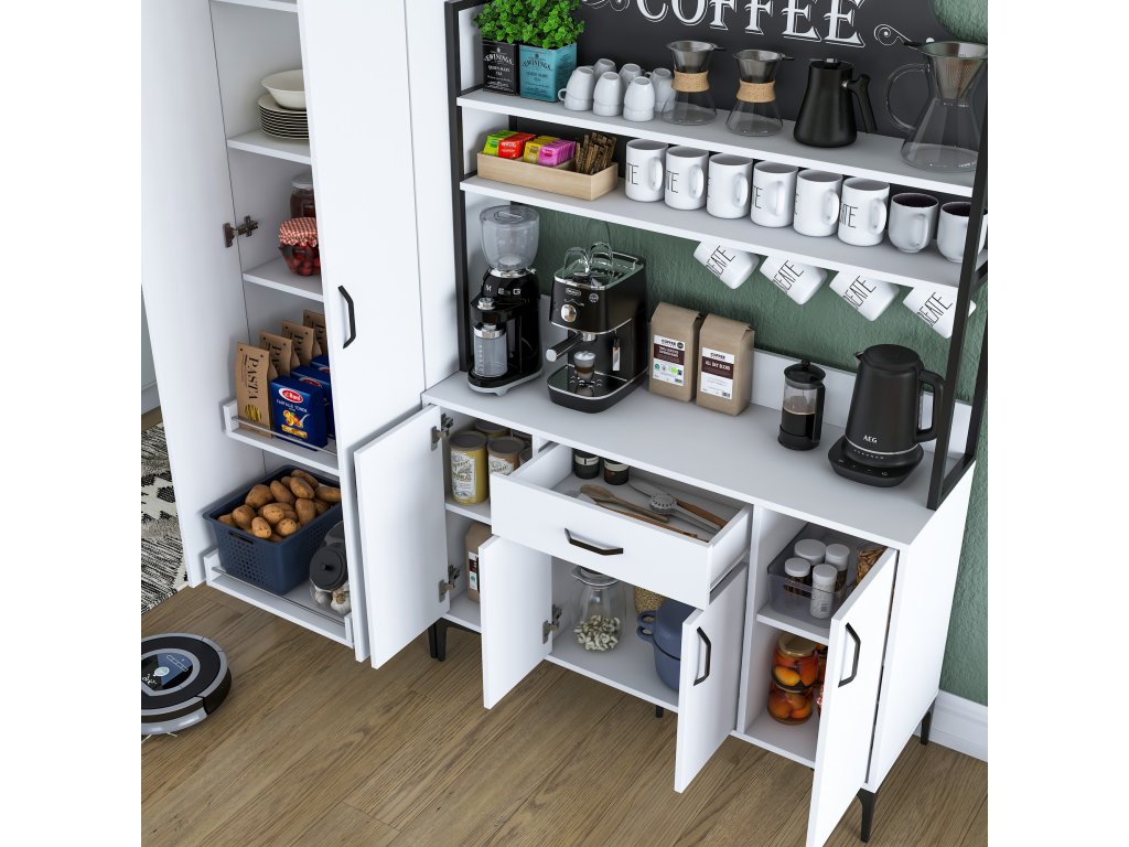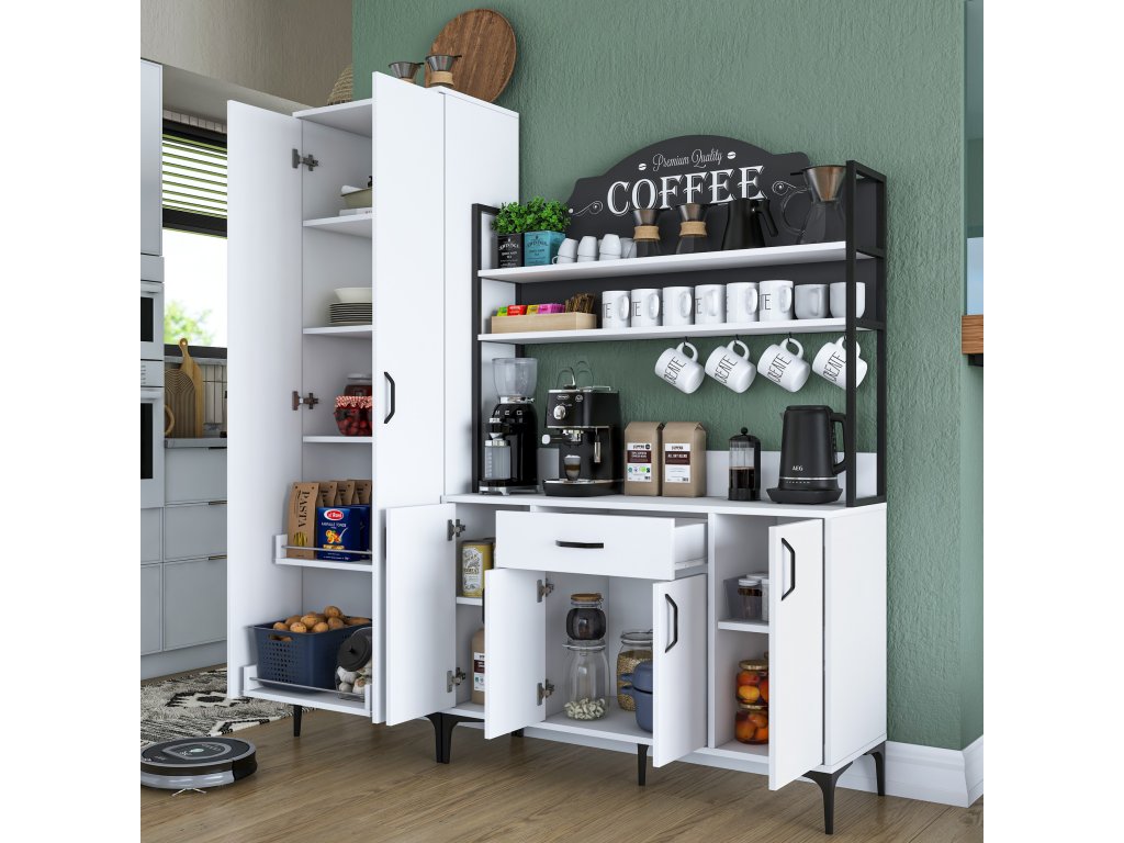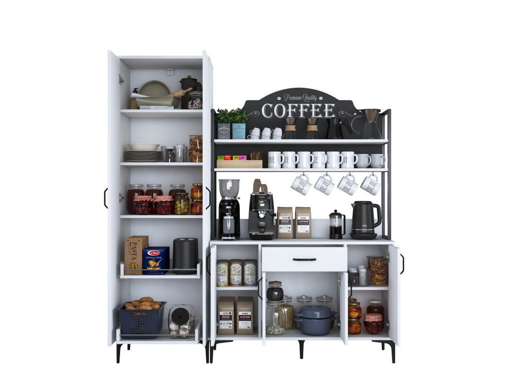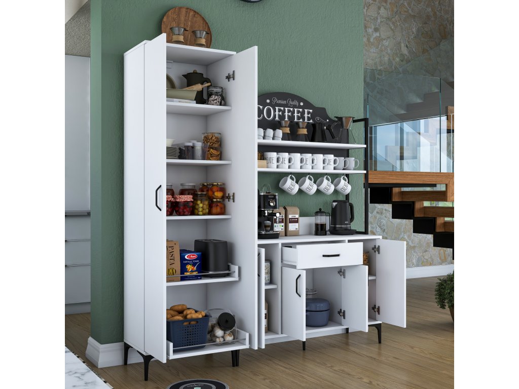 Skriňa DANGER je navrhnutá pre maximálne využitie úložného priestoru. Obsahuje šesť plných dvierok, jednu zásuvku a praktický regál, ktoré poskytujú dostatok miesta na uskladnenie kuchynských potrieb, riadu či ďalších predmetov. Jej viacúčelový dizajn zaisťuje ľahké usporiadanie a prístup ku všetkému, čo potrebujete.